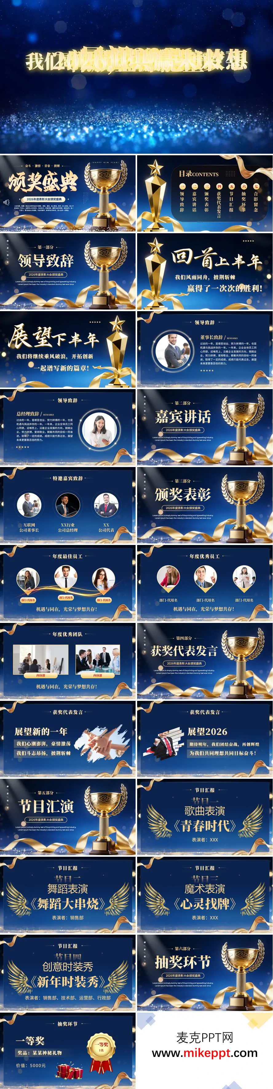 这是一套为 2026 年度颁奖盛典精心打造的流程课件,整体设计以蓝金为主色调,搭配奖杯和丝带等元素,展现出高端正式的风格,完整覆盖了盛典的全流程,为活动的顺利推进提供了有力支持。 课件开篇以 “我们的辉煌与梦想” 为主题,巧妙引出整个颁奖盛典的核心理念,为活动奠定庄重而激昂的基调。目录清晰地规划了 7 大核心环节,确保活动流程井然有序。 首先是领导致辞板块,涵盖董事长、总经理以及特邀嘉宾的精彩发言。在致辞中,领导们不仅回顾了上半年团队在风雨中同舟共济取得的卓越成绩,还展望了下半年乘风破浪的宏伟规划,为全体成员注入信心与动力。紧接着是嘉宾讲话环节,进一步为活动增添分量与期待。 核心环节是颁奖表彰,涵盖年度最佳员工、优秀员工、优秀团队等多项荣誉,对过去一年中表现突出的个人和团队进行隆重表彰,激励全体员工在新的一年继续奋进。 随后是获奖代表发言环节,代表们分享自己的感悟与体会,并对 2026 年的发展进行展望,传递出积极向上的正能量。为了丰富活动内容,中间穿插了精彩的节目汇演,包括歌曲、舞蹈、魔术表演以及创意时装秀等,为盛典增添欢乐与活力。同时,还设置了抽奖环节,分别抽取一、二、三等奖,进一步活跃现场氛围,调动大家的积极性。 最后,以合影留念和企业宣言作为收尾,全体成员共同记录下这难忘的时刻,并以企业宣言彰显团队的凝聚力与向心力。结尾页明确标注 “盛典圆满结束”,为整个活动画上圆满的句号。 整套 PPT 逻辑清晰,不仅串联了致辞、颁奖、表演等各个环节,还完美契合颁奖盛典的正式质感,是支撑活动顺利推进的重要工具,为这场年度盛会增添了光彩与意义。