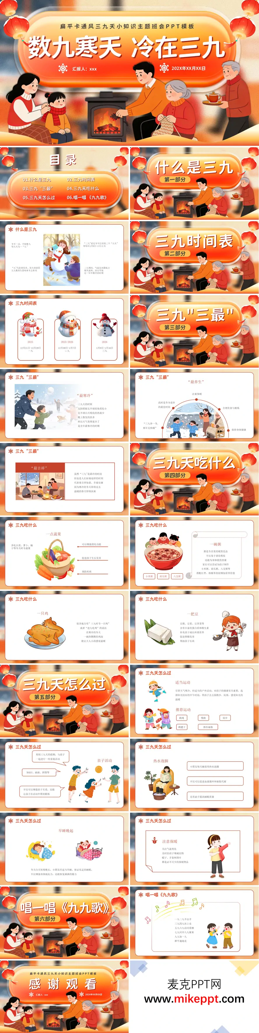 这套以“三九天小知识”为主题的班会PPT模板,采用扁平卡通风格设计,整体内容围绕“数九寒天冷在三九”这一传统节气知识展开,分为六个主要部分,结构清晰、图文并茂,适合用于校园主题班会或冬季健康知识普及。 PPT首先介绍了“什么是三九”,指出三九是冬至后第三个“九天”,通常为每年1月9日至17日左右,是一年中气温最低、最为寒冷的时期。随后展示“三九时间表”,为观众提供明确的时间节点。在“三九‘三最’”部分,PPT从“最寒冷”“最养生”等角度说明三九的气候特点和人文意义,强调其虽寒冷但也蕴含迎祥纳福的寓意,并配有一张富有象征性的插图: 接下来,“三九天吃什么”部分提出冬季饮食建议,包括多食时令蔬果、多喝粥、适当吃鸡和豆制品,以增强抵抗力。“三九天怎么过”则从运动、亲子活动、保暖、作息等方面给出实用建议,如适当进行跳绳、慢跑等户外运动,开展家庭互动,注意热水泡脚和早睡晚起等。最后部分以传唱《九九歌》收尾,生动形象地总结了数九寒天的气候变迁,富有文化趣味性。 整份PPT内容兼具科普性和实用性,语言通俗易懂,插图风格温馨,适合用于向学生群体传递冬季健康知识与传统文化。