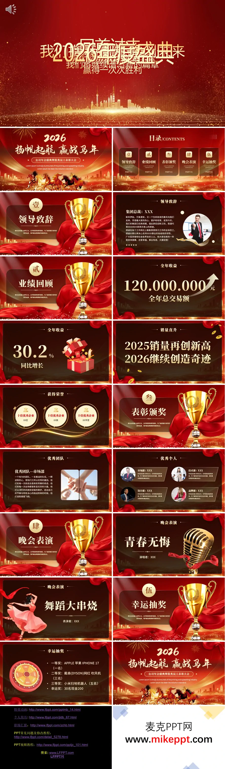 这是一套为 2026 年公司年会暨优秀员工表彰精心设计的课件,主题为 “扬帆起航 赢战马年”,整体风格以红金为主色调,搭配充满活力的马元素和璀璨的城市夜景,完美契合马年喜庆隆重的氛围,结构清晰且完整覆盖了年会的全流程。 课件以 “2026 年度盛典” 开篇,迅速将观众带入年会的热烈氛围中。目录清晰划分为 5 大板块,确保活动流程紧凑且有条不紊。 首先,是领导致辞环节,集团总裁亲自上台发表年度寄语,为全体员工送上新一年的祝福与期望,激励大家在新的一年中再创佳绩。紧接着是业绩回顾板块,课件通过精美的图表和数据展示,呈现了公司全年 1.2 亿元的总交易额以及 30.2% 的同比增长成绩,同时突出公司在多个区域荣获 “千佳优秀企业” 的殊荣,让每一位员工都能感受到公司的强大实力与卓越成就。 核心环节是表彰颁奖,对过去一年中表现卓越的团队和个人进行隆重表彰。市场部凭借出色的业绩被评为优秀团队,同时,来自市场、技术等关键部门的优秀个人也分别获得表彰,他们的努力与付出得到了公司和全体同事的认可与赞誉。 随后是晚会表演环节,精彩纷呈的节目为年会增添了欢乐与活力。《青春无悔》的深情演唱、激情四溢的舞蹈大串烧等节目,让现场气氛高潮迭起,展现出员工们的多才多艺和青春活力。 最后是幸运抽奖环节,设置了不同等级的奖项,包括 iPhone 17、戴森吹风机等精美礼品,以及现金幸运奖,进一步调动了现场的气氛,让每一位员工都充满期待。 整套 PPT 不仅回顾了年度业绩、表彰了核心人员,还通过精彩的表演和丰富的抽奖活动,极大地丰富了年会的形式,为这场年度盛会提供了清晰的流程指引,是串联年会各个环节的实用工具,让每一位参与者都能在喜庆与欢乐中开启新的一年。
