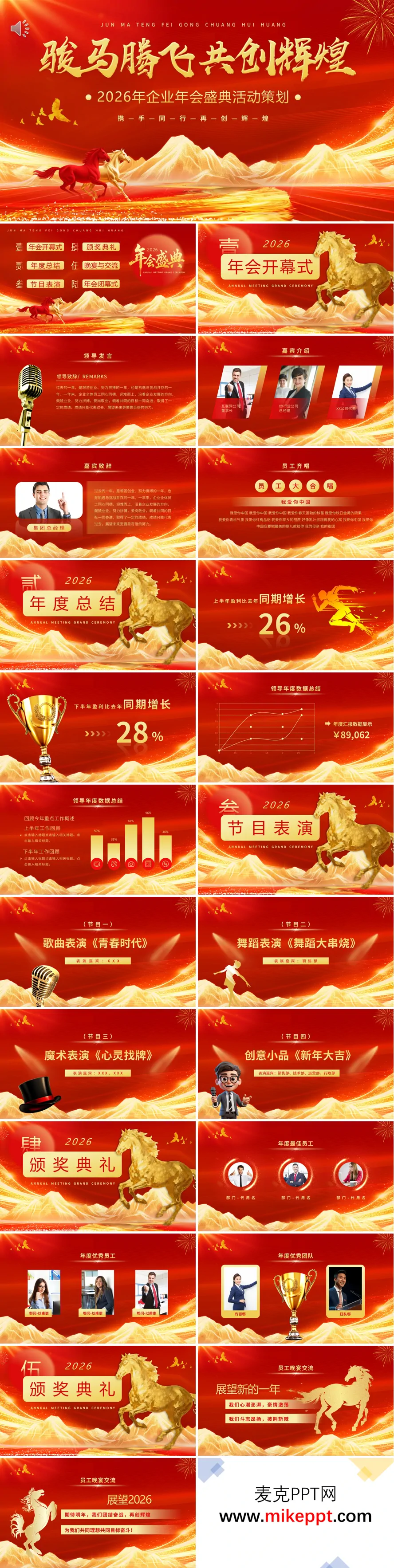 这是一套精心策划的 “骏马腾飞 共创辉煌” 主题 2026 企业年会盛典课件,整体设计以红金为主色调,搭配充满活力的马元素,风格喜庆隆重,完美契合马年氛围,完整覆盖了年会的全流程,为活动的顺利开展提供了清晰的指引。 课件以主题页开篇,迅速将观众带入年会的热烈氛围中。目录清晰划分为 6 大板块,确保活动流程紧凑且有条不紊。 首先,是年会开幕式,包含领导发言、嘉宾介绍以及嘉宾致辞,为年会拉开序幕。此外,还特别设置了员工合唱《我爱中国》的暖场环节,用激昂的歌声表达对祖国的热爱,为年会增添了一份庄重与温暖。 接下来是年度总结板块,通过精美的图表和详实的数据,展示了上半年 26% 和下半年 28% 的盈利增长,直观呈现了公司在过去一年取得的优异成绩。同时,领导对全年工作进行复盘,总结经验、展望未来,为全体员工指明了发展方向。 随后是节目表演环节,精彩纷呈的节目为年会增添了欢乐与活力。歌曲《青春时代》唱响青春的旋律,舞蹈大串烧展现了员工的多才多艺,魔术《心灵找牌》引发现场阵阵惊叹,创意小品《新年大吉》则用幽默诙谐的方式传递新年的祝福,让现场气氛高潮迭起。 核心环节是颁奖典礼,对过去一年中表现卓越的年度最佳员工、优秀员工及优秀团队进行隆重表彰,激励全体员工在新的一年继续努力奋斗,创造更多辉煌。 之后是晚宴交流环节,员工们在轻松愉悦的氛围中交流分享,同时嵌入对 2026 年的展望以及团队风采展示,进一步凝聚团队力量,激发员工的归属感与责任感。 最后是年会闭幕式,以新年祝福收尾,为整场年会画上圆满的句号。结尾页标注 “演示完毕”,让参与者清晰感受到年会的结束,同时也带着满满的收获与期待离开。 整套 PPT 既用数据回顾了年度业绩,又通过多元化的环节设计烘托了年会的喜庆氛围,让每一位参与者都能在欢乐与感动中度过一个难忘的年会。