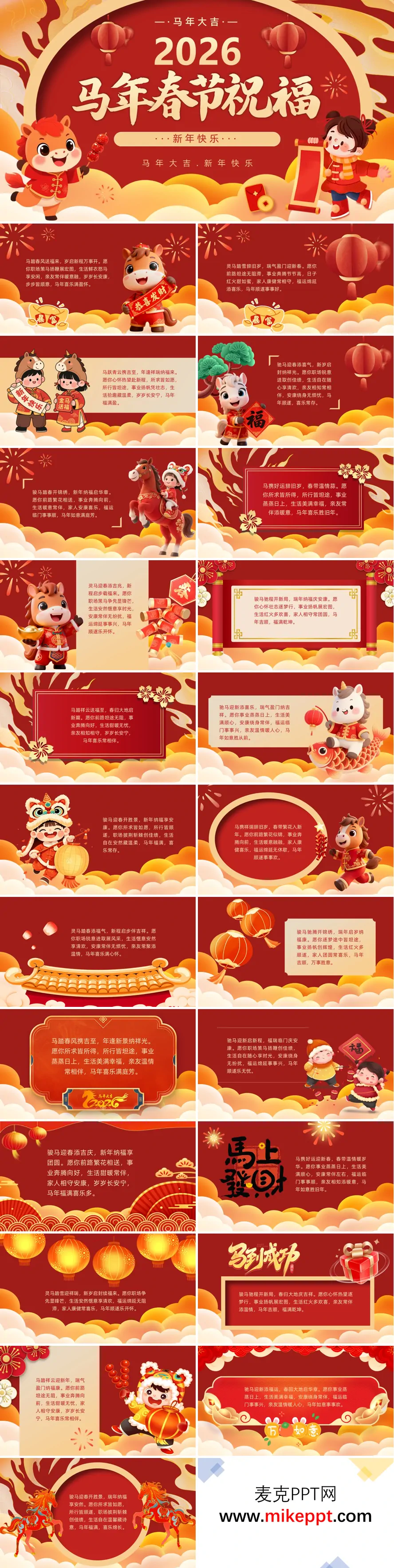 这套PPT以“2026马年春节祝福”为主题,整体设计风格喜庆祥和,充满浓厚的传统节日氛围。封面页以“马年大吉”和“新年快乐”为核心标题,搭配“2026”年份标识,简洁明了地突出了新春祝福的核心信息。 内容页通过多组对仗工整、韵律优美的祝福语,从事业、生活、家庭、健康等多个维度,表达了对新年的美好祝愿。每段文字均以“马”为核心意象,巧妙运用“策马扬鞭”“马踏春风”“骏马驰程”等生动比喻,既贴合生肖主题,又传递出积极奋进、吉祥如意的寓意。整体文案辞藻华丽,情感真挚,反复强调“顺遂”“安康”“喜乐”等关键词,强化了温暖、祥和的节日祝福基调。 版式设计上,页面布局清晰,文字排列有序,通过符号分隔和留白处理,增强了视觉的节奏感与呼吸感。整套PPT内容连贯统一,语言风格典雅而不失亲切,适用于春节贺卡、祝福邮件或节日演示等场景,能有效传递诚挚的新年祝愿。