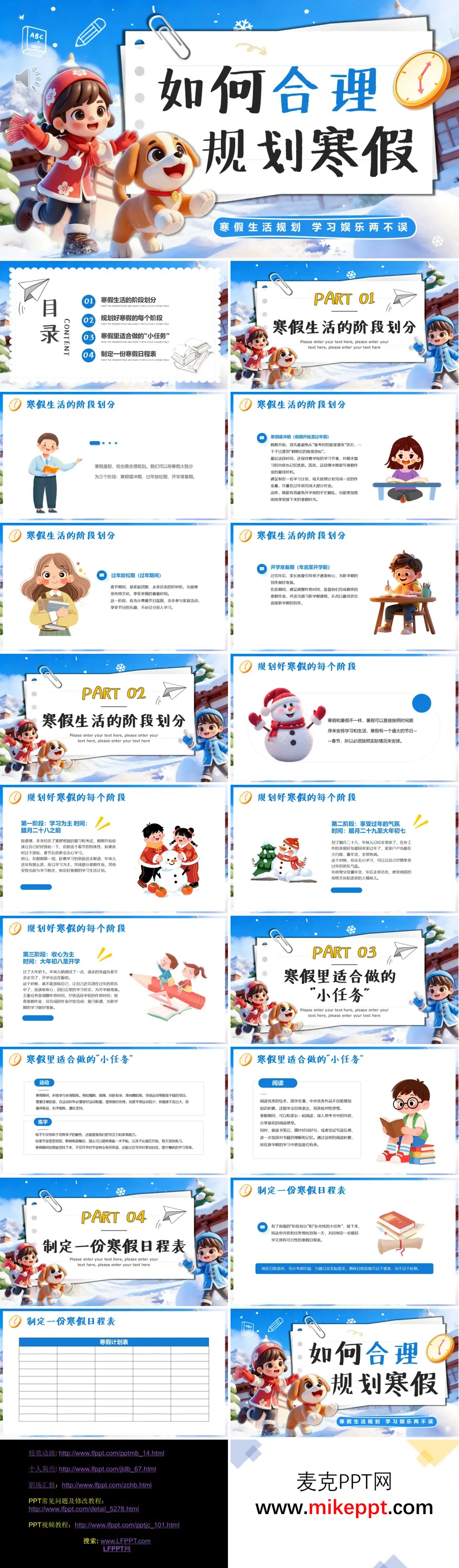 这是一份针对学生寒假规划的实用PPT指南,共包含四个核心部分。第一部分将寒假划分为三个阶段:寒假缓冲期(假期开始至过年前)建议保持学习节奏,完成大部分作业;过年放松期(过年期间)应充分参与家庭活动,感受传统文化;开学准备期(年后至开学前)需调整作息,完成作业并预习新课。 第二部分明确了各阶段具体时间:腊月二十八前以学习为主,完成部分作业;腊月二十九至大年初七享受过年气氛,帮助父母置办年货、走亲访友;大年初八至开学则应收心调整,回归正常学习状态。 第三部分推荐了寒假三项小任务:坚持体育锻炼(如慢跑、跳绳、球类运动),练字培养耐性和专注力,以及阅读优秀作品并做读书笔记。最后强调需根据个人情况将这些内容细化到每日,制定科学可行的寒假日程表,做到学习娱乐两不误。