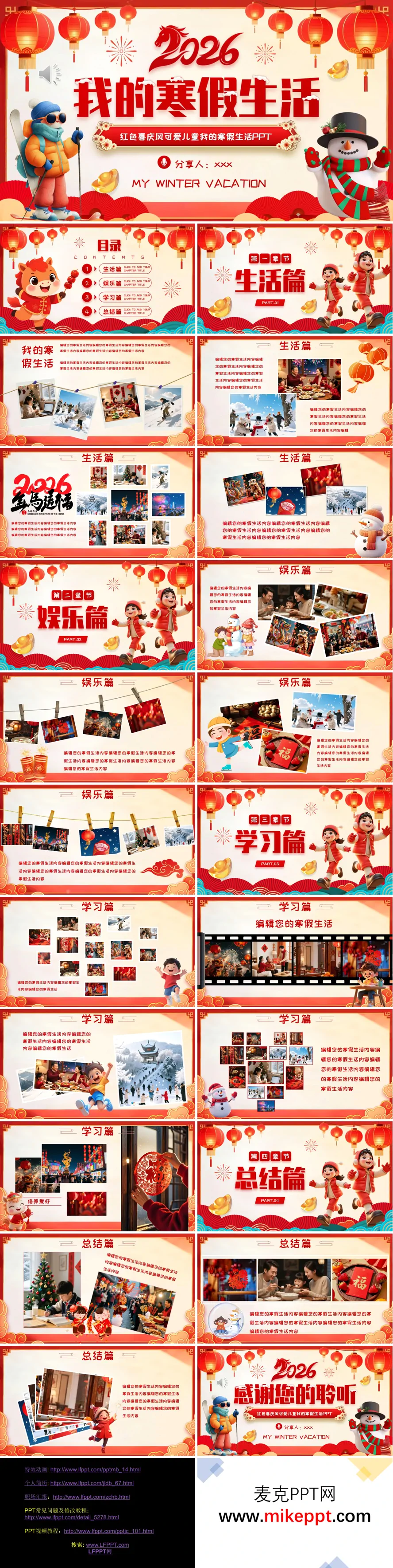 这套以“我的寒假生活”为主题的PPT采用了红色喜庆的可爱儿童风格,整体设计充满节日氛围。封面页以“MY WINTER VACATION”为主标题,搭配传统吉祥语“馬年大吉”和骏马图案,突出新春特色。 内容结构分为四个篇章:生活篇通过多页图文展示日常片段,强调家庭互动与年俗活动;娱乐篇包含游戏、旅行等休闲项目,配有多元版式设计;学习篇侧重知识积累与兴趣培养,特别设置“培养爱好”专栏;总结篇以回顾反思收尾,体现寒假的成长收获。 设计上大量使用灯笼、祥云等红色元素,搭配手绘风格的儿童形象,既符合春节主题又凸显童趣。页面布局灵活,通过分段标题与留白控制节奏,最后以致谢页完整收束,整体兼顾逻辑性与视觉美感,生动还原了孩子视角下丰富多彩的假期生活。