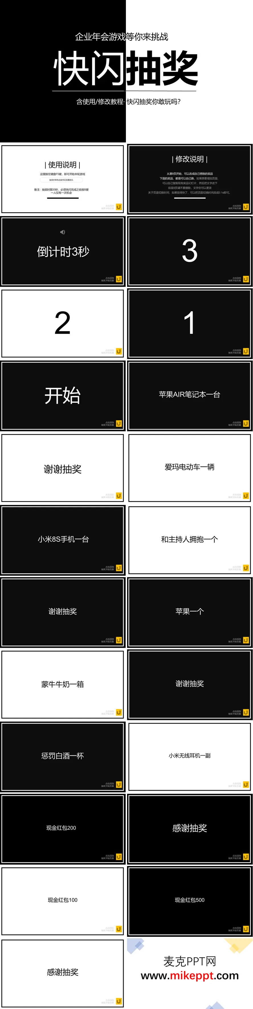 这是一套专为企业晚会设计的 “快闪抽奖” 互动课件,整体风格采用黑白高对比色调,简洁而富有视觉冲击力,完美契合快闪环节紧凑、高效的节奏,是晚会抽奖环节活跃氛围的绝佳工具。 课件开篇直接点明 “快闪抽奖” 主题,迅速聚焦观众注意力。紧接着,通过清晰的页面展示抽奖规则说明,确保每位参与者都能快速了解流程,避免混乱。随后,利用极具张力的 “3-2-1” 倒计时衔接 “开始” 指令,瞬间点燃现场情绪,将观众的期待值拉满,为抽奖环节营造紧张而兴奋的氛围。 核心部分是循环滚动的奖品列表,设计极具创意与吸引力。奖品种类丰富多样,既有高价值的实物奖品,如苹果笔记本、爱玛电动车、小米 8 手机等,满足不同参与者对高端礼品的期待;也有现金红包,金额从 200 元到 500 元不等,直接而实惠;还有实用好物,如蒙牛牛奶、商务背包、铂金项链等,兼顾日常与品质需求。更有趣的是,课件中还设置了 “和主持人抱一个”“苹果一个” 等趣味奖品,瞬间打破常规,为抽奖环节增添欢乐与惊喜,让现场笑声不断。 整套 PPT 通过文字和奖品信息的快速切换,营造出抽奖环节特有的紧张感与惊喜感。黑白高对比的视觉风格不仅让信息传递清晰,更强化了抽奖的仪式感。这种设计不仅让参与者全神贯注,更在每一次奖品切换中带来新的期待与欢笑,是企业晚会中带动互动氛围、提升参与感的完美适配工具。