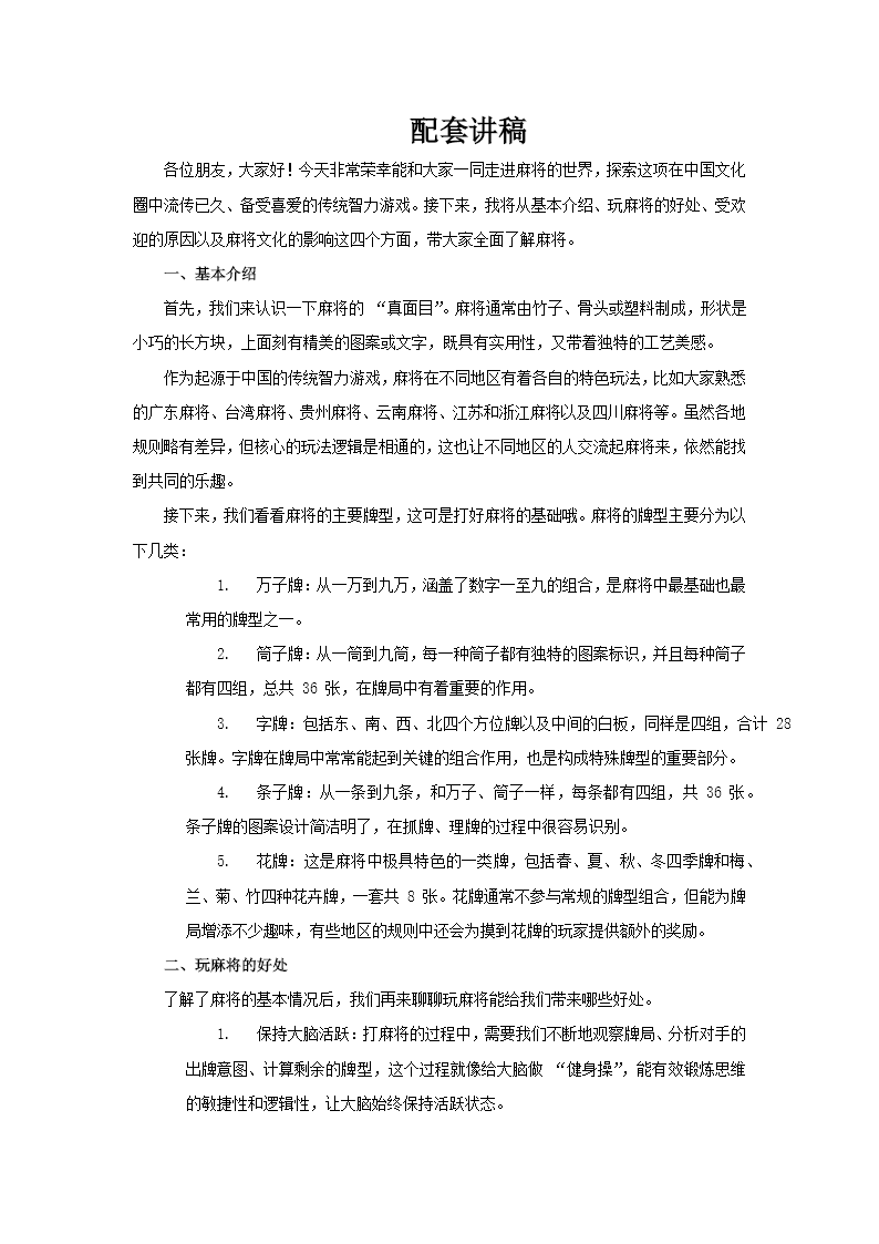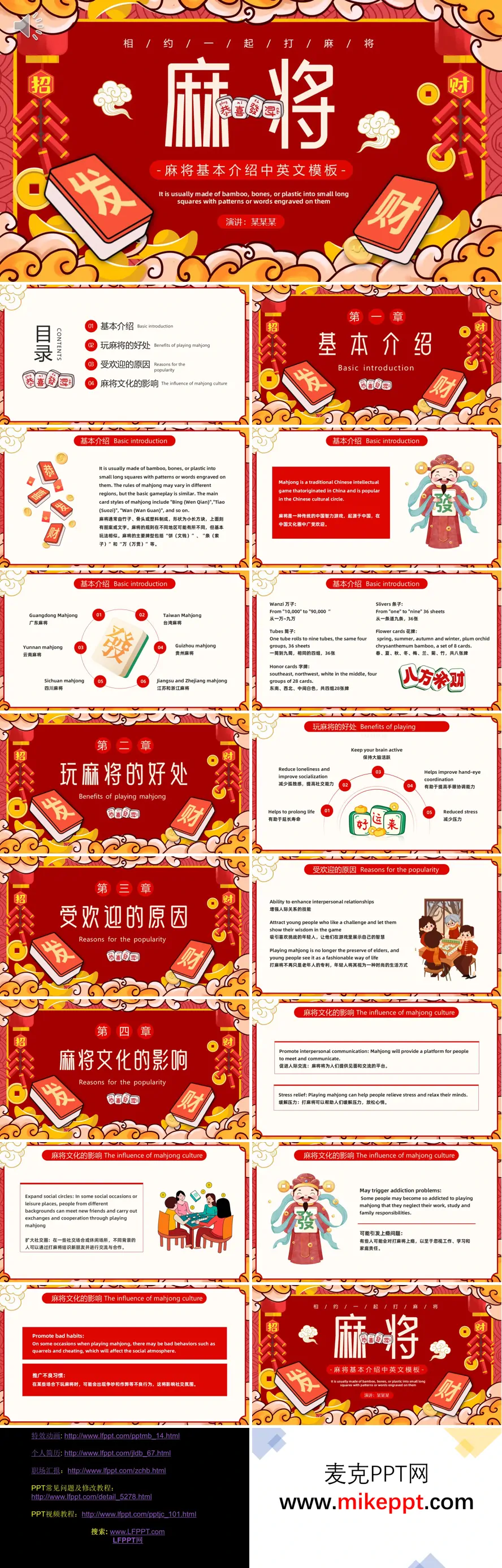 这套 PPT 是以“相约一起打麻将”为主题的中英文介绍材料,采用红金喜庆风格,通过四个模块全面展现了麻将这一中国传统娱乐形式的多面性。 在“基本介绍”模块,PPT 首先介绍了麻将的材质,通常由竹木、骨或塑料制成,它不仅是中国的传统智力游戏,还承载着深厚的文化底蕴。接着,PPT 详细讲解了麻将的核心牌型,如万、条、筒等,并对广东、四川、台湾等不同地区的麻将玩法差异进行了对比分析,让观众快速了解麻将的基本规则和地域特色。 “玩麻将的好处”模块则从心理学和生理学角度出发,列举了麻将的诸多正向作用,包括减少孤独感、活跃大脑思维、提升手眼协调能力以及缓解压力等。这些好处不仅让麻将成为一种有益的休闲方式,也使其在现代社会中备受推崇。 在“受欢迎的原因”模块中,PPT 指出麻将作为一种社交活动,能够有效增进人际关系,满足玩家的挑战欲望。它不仅是长辈们喜爱的休闲选择,也逐渐成为年轻人的时尚娱乐方式,跨越了年龄和代际的界限,成为一种全民性的娱乐活动。 最后,“麻将文化的影响”模块对麻将的正面和负面价值进行了客观分析。一方面,麻将促进了人际交流,帮助人们放松身心;另一方面,PPT 也提醒观众注意其可能带来的问题,如过度沉迷可能影响工作和学习,甚至引发争执。这种全面的视角让观众能够理性看待麻将这一传统娱乐形式。 整套 PPT 结构清晰,内容丰富,兼顾了麻将的常识、价值与争议,不仅适合对麻将感兴趣的初学者,也为麻将爱好者提供了更深入的思考。通过中英文双语介绍,PPT 还有助于将麻将文化推向国际舞台,让更多人了解这一独特的中国文化符号。