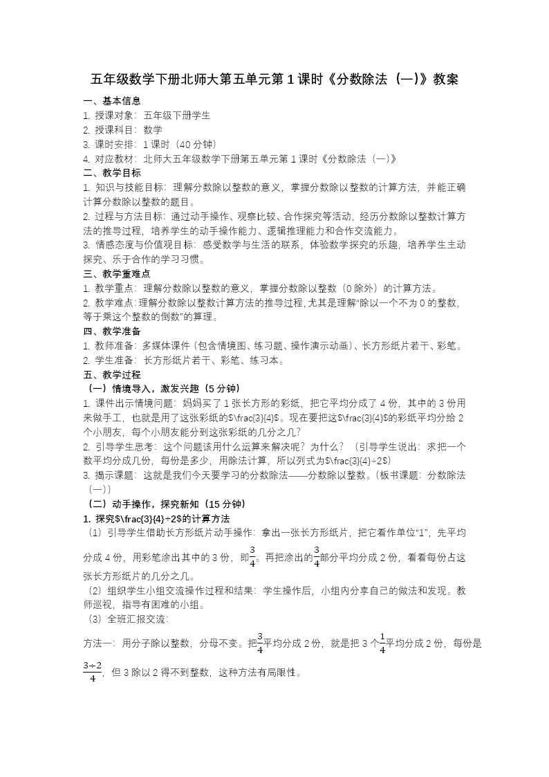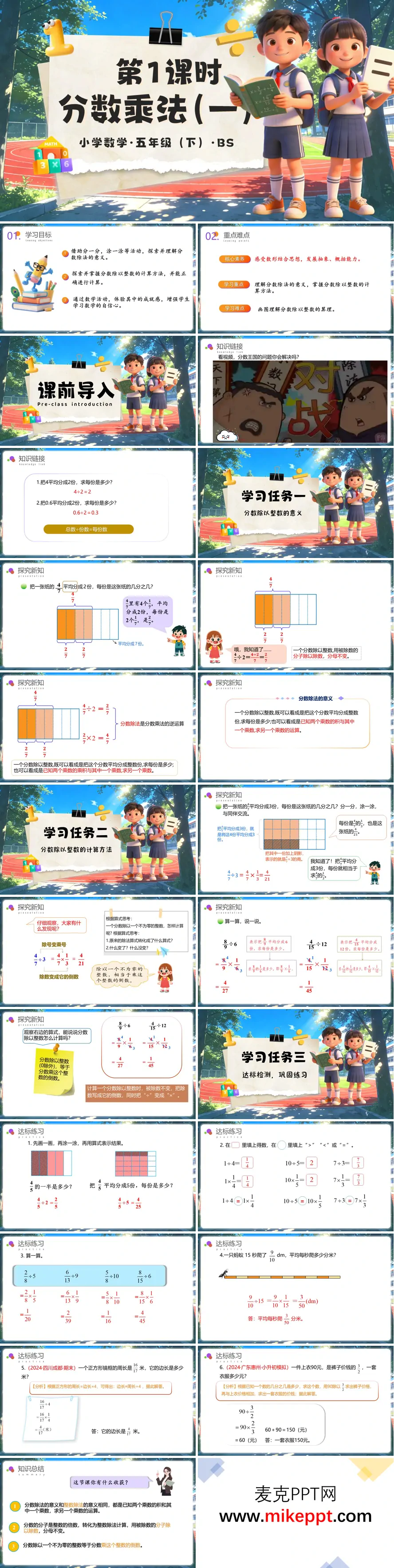 这份北师大版五年级下册“分数乘法(一)”课件(分数除以整数)以“分纸涂色”实验为主线,通过“动手分—动笔画—动脑想”三联动,引导学生从“分子直接除”走向“乘倒数”的本质理解,感受分数除法与乘法的互逆关系。开篇用“整数、小数除法”快闪口算唤醒旧知,教师追问“分数也能直接除吗?”自然链接新课。 探究环节分两步递进:①先研究4/7÷2,学生把长方形纸平均分成7份,涂出4份,再横向对折成2份,直观看到“每份是2/7”,动画同步呈现“分子4÷2=2,分母7不变”,初步归纳“分子除以整数”的方法;②再抛出4/7÷3,发现“4不能被3整除”,引发认知冲突,教师引导学生把“平均分”转化为“求4/7的1/3”,即4/7×1/3,动画把“横切再竖分”展示为“乘倒数”过程,顺势板书核心法则:分数除以不为零的整数,等于乘这个整数的倒数,并用“逆运算”双向箭头突出乘除互逆。 数形结合贯穿始终:每次涂色后,动画把“横向切(除)”与“竖向乘(倒数)”叠加,学生直观看到“两种切法结果相同”,从而理解“乘倒数”算理,而非机械记忆。 达标练习6道题层层递进:①画图计算——用分数条表示4/7÷3;②等式比较——验证÷n与×1/n结果相等;③直接运算——含约分;④生活应用——蚂蚁爬行、正方形边长、衣物价格等期末真题,学生先独立画图或写算式,再系统实时批改,教师针对“倒数写反”“约分漏写”再示范,确保“会算、会画图、会解释”全程过关。 总结用“一张思维导图”收束:意义——平均分;方法——乘倒数;关系——乘除互逆,学生用便利贴写下“最得意的一次画图”贴于展板,形成班级“除法智慧墙”;自我评价从“我敢画图、我懂倒数、我肯检查”三面点赞,小组互评贴星星,让知识、情感双提升。 整份课件用“涂色激趣—动画转化—对比验证—生活应用”四连击,把分数除以整数从“分子直接除”升级为“会乘倒数、会画图解释”的数理融合,既突破“理解算理”难点,又培养数形结合与推理能力,为后续学习分数除以分数、混合运算奠定坚实而有趣的基础。