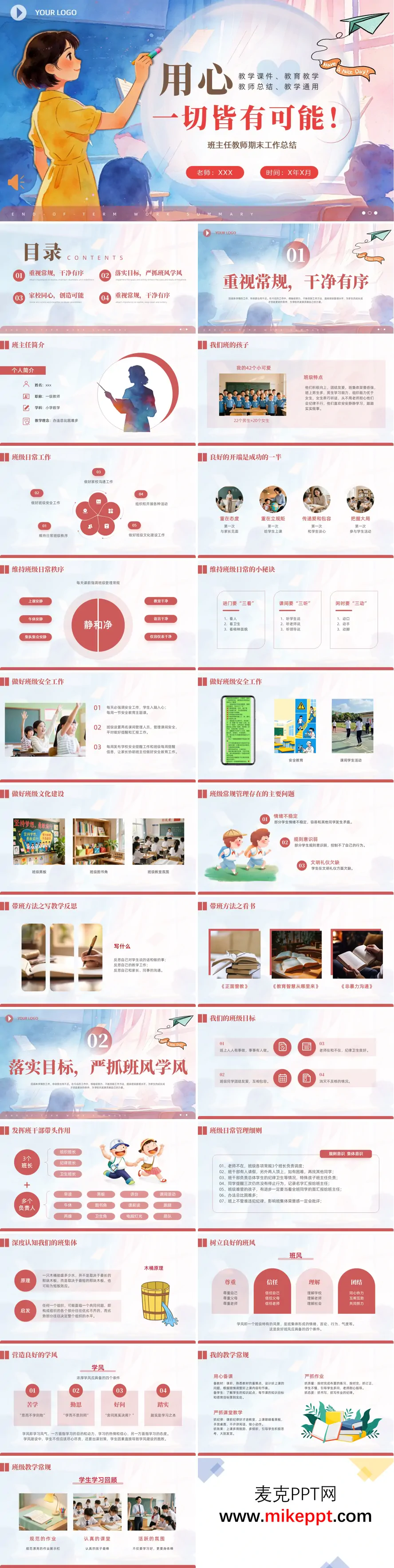 这套PPT以班主任期末工作总结为主题,内容结构清晰,围绕班级常规管理、班风学风建设、家校协同以及教学实践展开,配在班级常规管理部分,PPT强调了“静与净”的日常要求,通过“进门三看”“课间三听”等具体方法维持秩序。插图展示了班级黑板报、图书角等文化环境布置,体现出注重班级文化建设的理念。安全教育工作通过每周提醒、课间管理等措施落实,图中课间活动场景也体现了对学生行为的关注。 班风学风建设方面,PPT以“木桶理论”强调集体协作,通过班干部分工、课堂纪律要求推动良好氛围形成。图片展示了学生认真书写作业的场景,以及课堂互动瞬间,体现出勤思好问的学风。教师还推荐了《非暴力沟通》等书籍,突出持续学习的理念。 家校合作部分,PPT提出“同心创造可能”,通过家长会、日常沟通建立信任。插图呈现了集体生日会、研学活动等生活场景,展现班级凝聚力。最后,PPT总结了管理中的不足与改进方向,并以“一切皆有可能”呼应主题,传递出积极向上的带班信念。