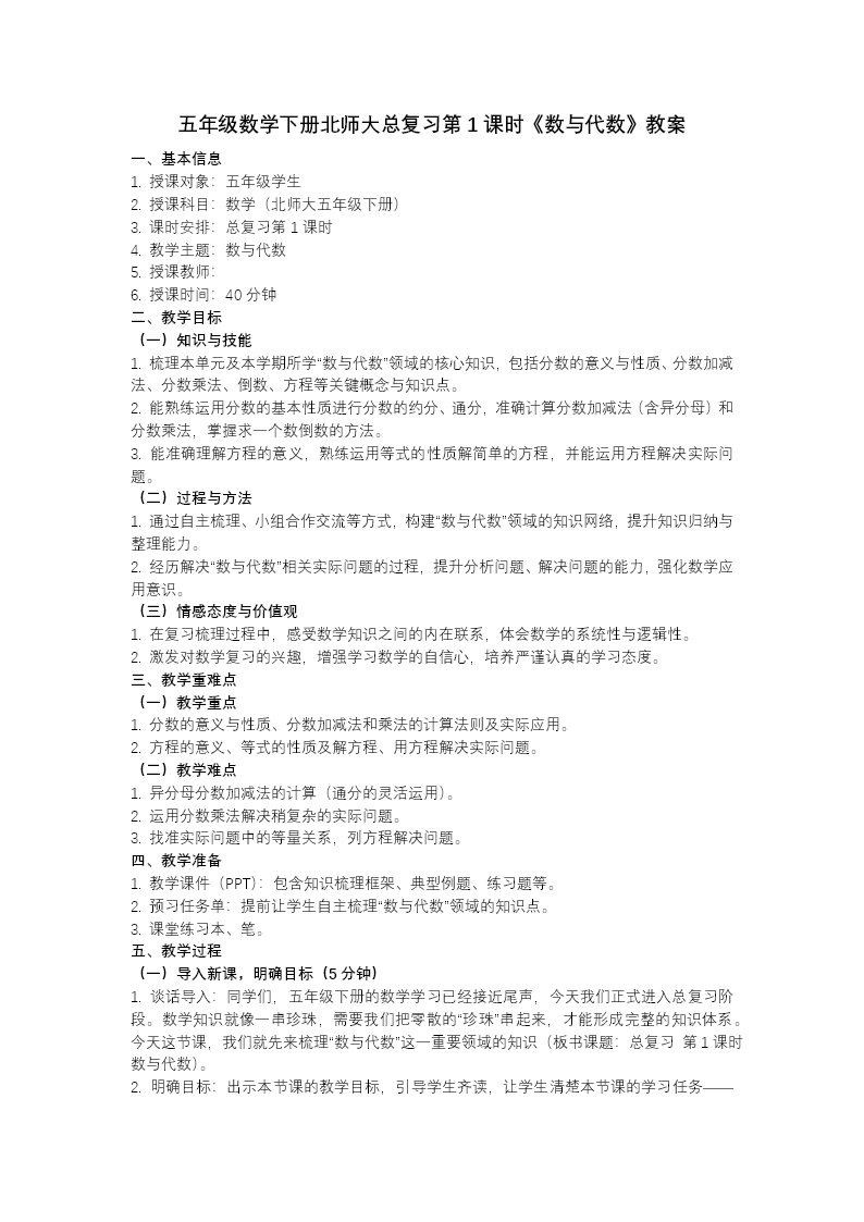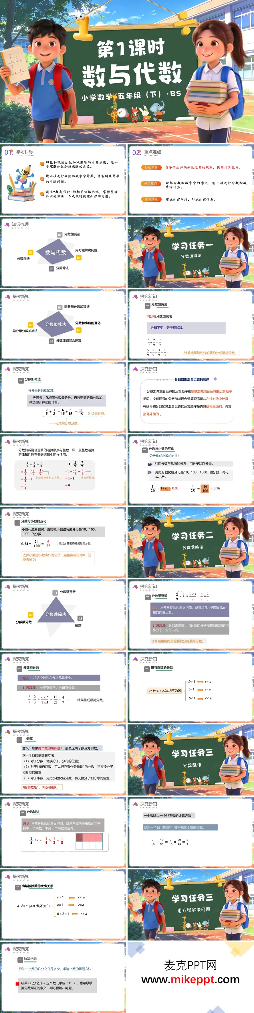 这份北师大版五年级下册“数与代数”复习课件以“知识网络—方法归纳—题型突破—综合提升”四步递进,将分数加减、乘除、互化及方程应用四大模块串成一条完整的“分数运算链”,助力学生从“会算”跃升到“会模、会用”。开篇用一张彩色思维导图总览:同分母→异分母→混合运算→乘除含倒数→互化→方程应用,一眼锁定复习范围。 知识梳理用“表格+口诀”双通道:异分母加减突出“先通分再加减,最小公倍最简便”;分数乘法强调“分子乘分子,分母乘分母,先约后乘”;分数除法提炼“除以一个数=乘它的倒数”;互化用“除法搬家”口诀:分数→小数用分子÷分母,小数→分数看位数写10、100再约分;方程应用归纳“设x→找等量→列方程→检验”四步,每条配生活图标,让抽象法则“有物可依”。 探究新知用“例题+线段图”强化典型模型:①“已知一个数的几分之几是多少求这个数”——用跳绳人数为例;②“含两个未知量”——用姐弟邮票问题;③“相遇问题”——用淘气笑笑相向而行,动画演示“路程和=总路程”的等量关系,渗透线段图建模思想。 达标练习7道题层层递进:①分数四则混合运算——含括号与简算;②解方程——含ax±bx=c;③实际应用——长方形围边、稿件合打、相向而行期末真题,学生先独立找等量,再系统实时批改,教师针对“通分不彻底”“方程设句写反”再示范,确保“会算、会列、会检验”全程过关。 总结用“一张思维导图”收束:意义→法则→互化→应用,学生用便利贴写下最易错点贴于展板,形成班级“运算警示墙”;自我评价从“我会算、我会列、我肯检验”三面点赞,小组互评贴星星,让知识、情感双提升。 整份课件用“导图导航—口诀速记—例题建模—真题提升”四连击,把数与代数从“零散计算”升级为“会算、会模、会应用”的综合能力,既突破“找等量关系”难点,又培养代数思维与优化意识,为期末综合解决实际问题奠定坚实的方法与信心双重基础。