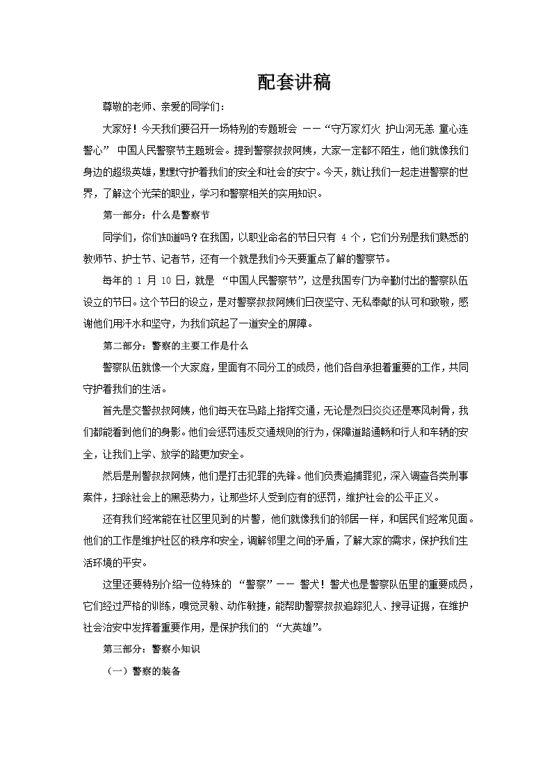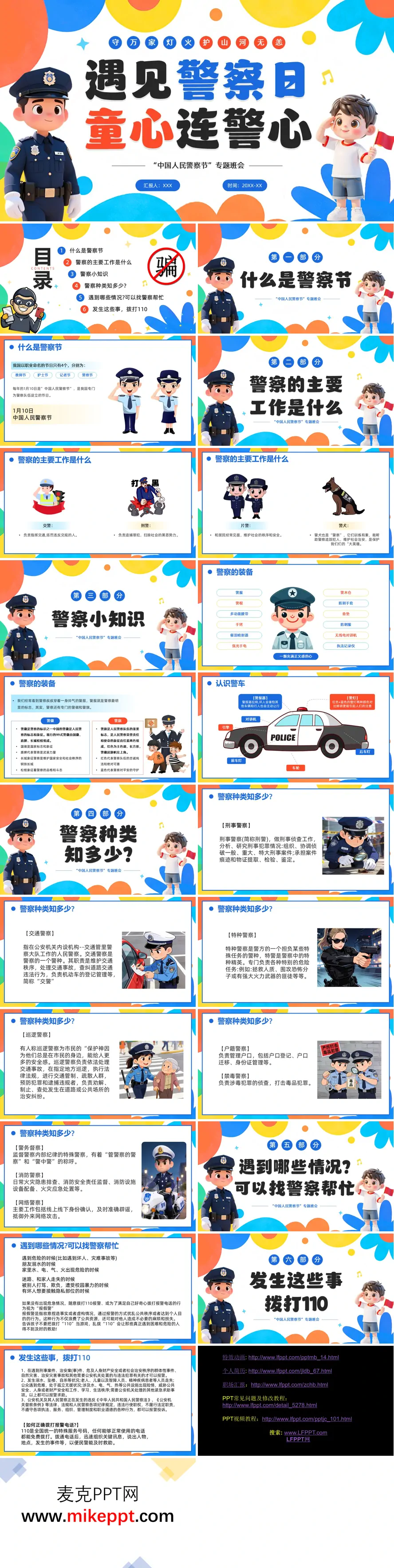 这套PPT以“中国人民警察节”专题班会为主题,通过图文并茂的形式系统介绍了警察节的相关知识。封面采用“遇见警察日童心连警心”的温馨标题,配合警徽元素,营造出庄重而亲切的氛围。 在“什么是警察节”部分,PPT明确标注1月10日为中国人民警察节,并特别强调这是全国仅有的四个职业节日之一,与教师节、护士节、记者节并列,凸显其特殊意义。随后通过图文结合的方式详细展示了警察的多元职能:配图说明刑警负责追捕罪犯,展现片警维护社区秩序的场景,甚至将警犬定义为特殊“警察”,生动体现警务工作的多样性。 “警察小知识”章节通过装备图解科普警用装备体系,从警棍、手铐到执法记录仪等专业器械,并深入解析警徽中盾牌、长城、松枝的象征意义,以及警旗红蓝配色代表的忠诚与平安理念。特别值得一提的是的创意配图,巧妙传递警察职业精神内核。 后续内容通过分类图示系统介绍刑警、交警、特警等警种职能,并针对青少年群体重点说明报警常识,强调“报假警”的危害性。最后以正确拨打110的实操指南收尾,形成完整的知识闭环。整套PPT既包含严谨的职业知识,又通过拟人化表达贴近儿童认知,实现了普法教育与价值引导的有机统一。