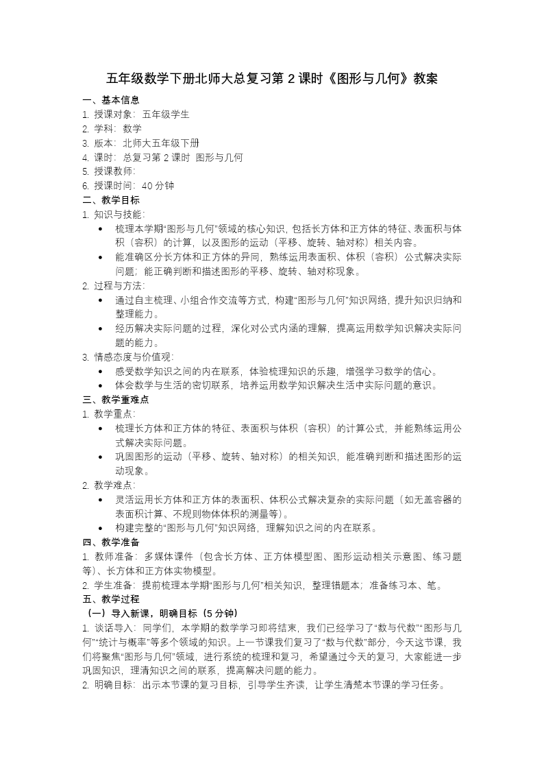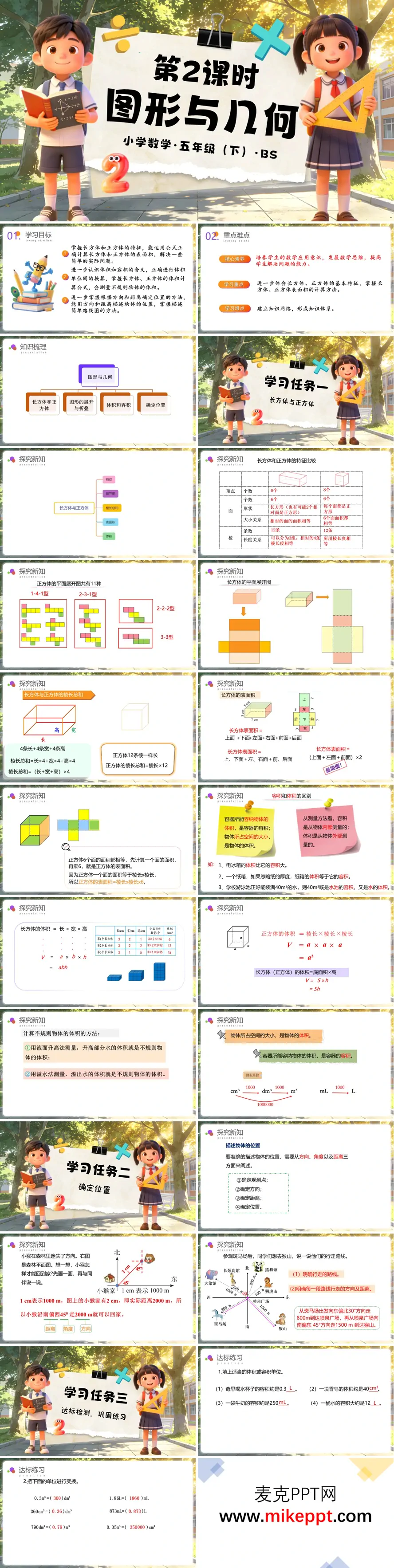 这份北师大版五年级下册“图形与几何”复习课件以“知识框架—特征对比—方法提炼—真题应用”四步递进,将长方体、正方体与位置确定三大模块串成一条完整的空间思维链,助力学生从“会算”跃升到“会辨、会测、会定位”。开篇用一张立体思维导图总览:特征→展开图→棱长总和→表面积→体积容积→不规则物体→方向距离定位,一眼锁定复习范围。 特征对比用“动态3D模型”旋转:长方体“相对面相等、棱分3组”,正方体“6面12棱全等”,学生用平板拖拽展开图,即时验证“11种正方体展开图”和“长方体相对面不相邻”,强化空间观念;公式梳理用“通用式”:表面积=(长×宽+长×高+宽×高)×2,体积=底面积×高,渗透“横切、竖切”等积变形思想。 不规则物体体积用“实验视频”双法:液面升高法——量筒水位上升差;溢水法——满杯溢出量,学生边看边记录数据,体会“转化”思想;位置确定用“三要素”口诀:方向+角度+距离,配合“动物园路线图”实景,让学生用量角器、刻度尺现场演练“观测点→方向角→距离”的完整描述。 达标练习7道题层层递进:①单位填写——给冰箱、橡皮选单位;②表面积计算——无盖鱼缸少一个面;③体积计算——已知体积求高;④不规则物体——铁块排水法;⑤位置描述——根据平面图写路线;⑥真题综合——储物柜切割后表面积变化,系统实时统计正确率,教师针对“少算面”“单位不统一”“观测点写错”再示范,确保“会算、会测、会描述”全程过关。 总结用“一张思维导图”收束:特征→公式→转化→定位,学生用便利贴写下最易错点贴于展板,形成班级“几何警示墙”;自我评价从“我会算、我会测、我肯描述”三面点赞,小组互评贴星星,让知识、情感双提升。 整份课件用“3D对比—实验视频—实景演练—真题综合”四连击,把“图形与几何”从“公式记忆”升级为“可感知、可测量、可描述”的空间综合素养,既夯实计算技能,又培养空间观念和位置推理能力,为期末综合解决图形与路线类题目奠定坚实的方法与信心双重基础。