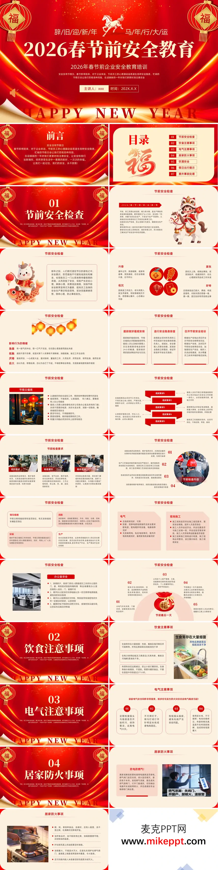 这套春节前安全教育培训PPT以“2026春节前安全教育”为主题,围绕节前企业安全风险防控与员工假日生活安全展开,内容结构清晰、覆盖全面。PPT开篇强调“安全没有节假日”的核心思想,指出春节前夕员工易因情绪波动(如兴奋、急躁、好奇等)滋生安全隐患,因此企业需提前部署值班安排、开展安全隐患排查并组织全员安全培训,确保“先安全后生产,不安全不生产”的原则落到实处。 在具体安全措施方面,PPT分模块详细阐释了节前检查要求,包括设备设施运行状态、消防器材维护、危险作业规范等,并配以等图示,直观展示办公室安全注意事项。此外,PPT还延伸至员工假日个人安全领域,涵盖饮食卫生、电气使用规范、居家防火、饮酒健康及出行防盗防抢等实用指南。例如,在居家防火部分,通过文字描述结合场景化建议(如油锅着火应盖锅盖而非泼水),强化应急处理能力。 最后,PPT特别纳入意外事故急救措施,如酒精中毒与失血性休克的应急处理步骤,并配以等图示,增强实操性。整体来看,这套PPT通过“企业-家庭-个人”多维度安全知识的串联,既提升了节前安全教育的系统性,又以图文结合的方式提升了内容的可读性与警示效果。