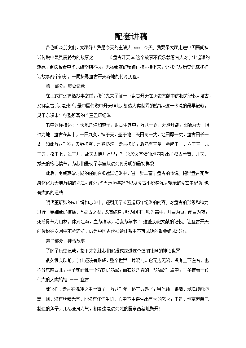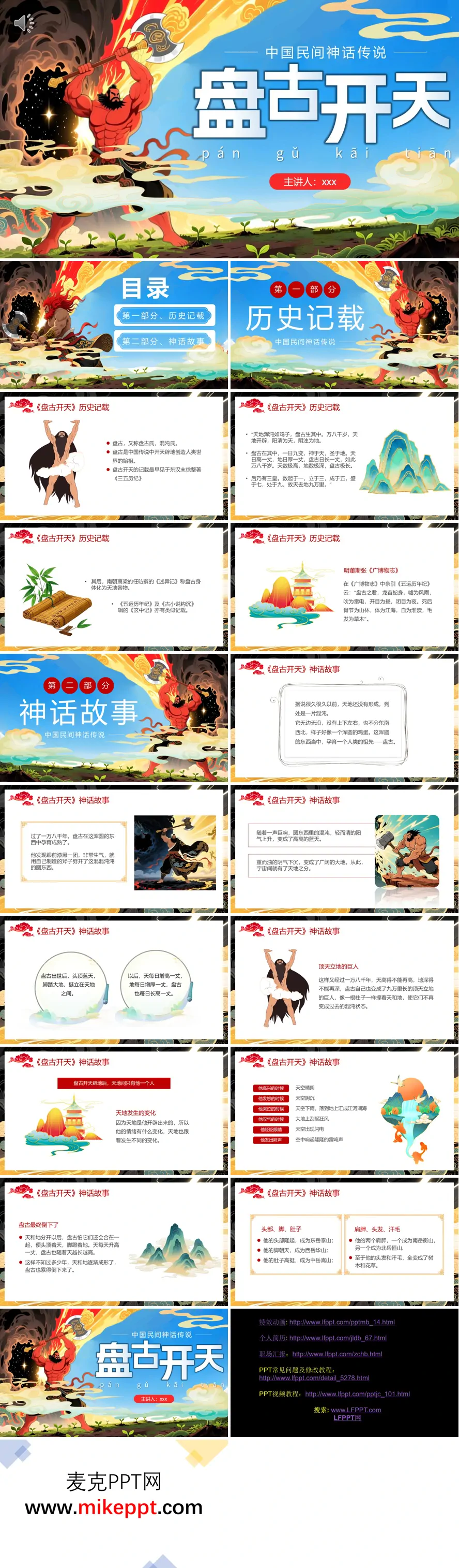 这套PPT以“盘古开天”为主题,系统梳理了中国古代创世神话的内容与文献源流。整体结构分为“历史记载”与“神话故事”两大部分,图文结合,脉络清晰。 在历史记载部分,PPT引用了多部古籍文献,说明盘古作为开天辟地始祖的形象演变。其中重点呈现了东汉徐整《三五历纪》中“天地混沌如鸡子,盘古生其中”的经典描述,记载盘古在混沌中孕育一万八千年后开辟天地,并随天地每日增长,最终“天去地九万里”。同时补充南朝《述异记》和明代《广博物志》的记载,强调盘古“龙首蛇身”“死后化身万物”的创世特征,如双目为日月、躯体化山岳、血液为江河等。 神话故事部分以叙事方式生动再现传说内容:从混沌如鸡卵的状态写起,描述盘古以斧劈开混沌,清阳上升为天,浊阴下沉为地。其后突出盘古顶天立地、每日生长的巨人形象,并展现其喜怒哀乐与自然现象的联系——如哭泣成雨、呼气成风。最后叙述他力竭倒下,身体化为五岳山峦,发肤成草木,完成天地万物的创造。 整套PPT通过文献与传说相结合的叙述,既体现神话的文学想象力,又突出其作为文化起源符号的历史内涵,完整呈现了盘古神话“生于混沌—开辟天地—垂死化身”的经典结构。