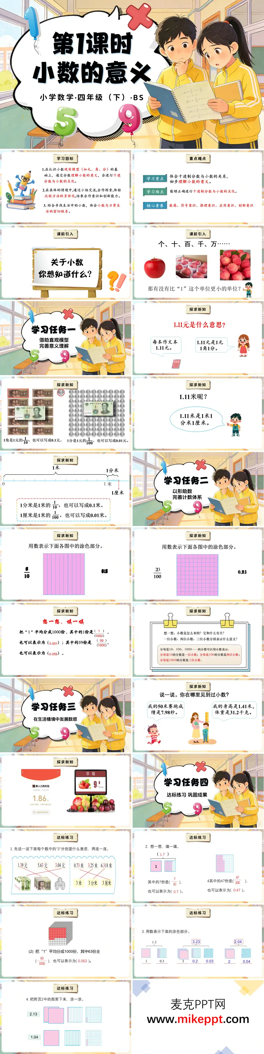 本课围绕“小数的意义”展开第一课时教学,以“比1更小的单位”这一富有挑战性的问题为切入口,依托元、角、分和米、厘米、毫米等真实模型,引导学生在“看得到、摸得着”的生活场景中感受小数的诞生与价值。课堂从1.11元、1.11米两个具体实例切入:1角=1/10元=0.1元,1厘米=1/100米=0.01米,借助十格条和百格条动画,让学生亲眼看到“1被平均分成10份、100份”,从而建立“十进分数—小数”一一对应的直观印象;再通过涂色图形,把1/10、1/100、1/1000分别写成0.1、0.01、0.001,顺势延伸到千分位,明确分母是10、100、1000……的分数与一位、两位、三位小数的关系,初步理解小数是“十进分数的另一种写法”。 为培养数感与符号意识,课件链接生活中的小数:赛跑计时9.98秒、身高1.45米、商品标签3.99元,让学生在读、写、说中体会小数“比1更小、更精确”的特点;小组合作环节,则让学生用十格条拼出指定小数并互评,激发创新思维。 达标练习由浅入深:先判断图形涂色部分表示的小数,再完成十进分数与小数互化填空,最后借助数轴比较0.3与0.29的大小;课后分层布置数学日记(记录身边小数)或创意作业(设计小数海报),让知识从课堂走向生活。 整体设计以“看得见、摸得着、用得上”的体验活动为主线,由生活实例到图形模型,再到符号抽象,层层递进,既突破“十进分数与小数互化”的难点,又让学生真切感受到小数与生活的紧密相连,为后续学习小数的性质、大小比较及四则运算奠定坚实的数感基础。