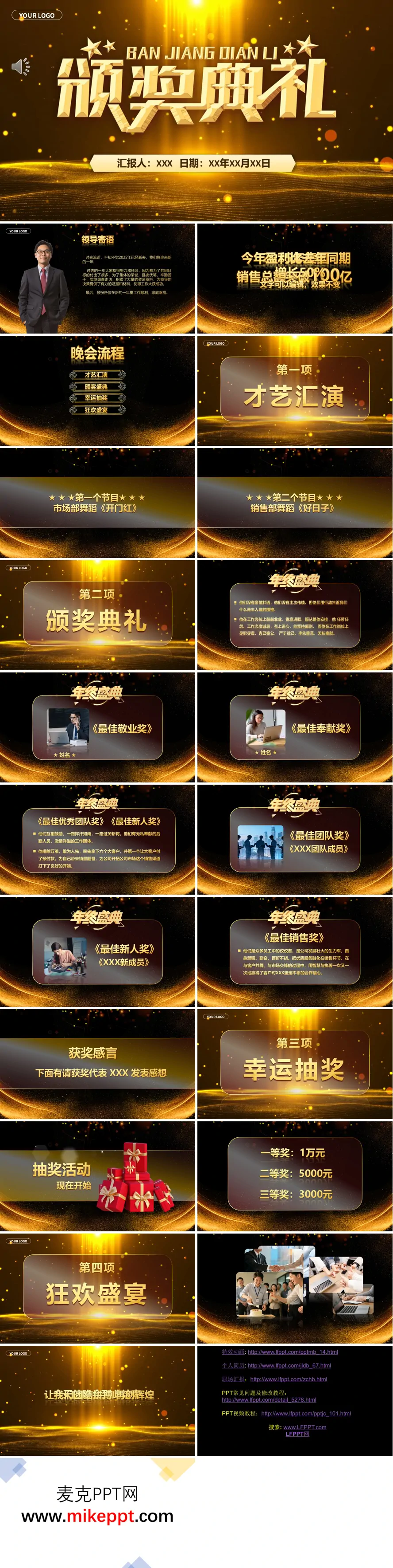 这是一套专为企业颁奖典礼精心设计的活动材料 PPT,整体风格采用金色华丽的色调,营造出庄重而热烈的氛围,全面覆盖了活动的全流程与核心环节,旨在通过表彰与庆祝,凝聚团队力量,激励员工迈向新高度。 PPT 开篇以领导寄语拉开序幕,回顾了企业在 2025 年取得的卓越成绩:盈利超出去年同期水平,销售总额同比增长 50%,突破 100 亿元大关。这一成绩不仅彰显了企业的强劲发展势头,也体现了全体员工的辛勤付出。领导在寄语中向全体员工送上诚挚的祝福,感谢大家在过去一年中的努力与奉献,为颁奖典礼奠定了鼓舞人心的基调。 随后,PPT 明确了晚会的流程安排,包含四大核心环节。首先是才艺汇演,市场部带来充满活力的舞蹈《开门红》,展现了团队开拓市场的豪情与信心;销售部则以舞蹈《好日子》呈现销售团队的风采,传递出业绩丰收的喜悦。精彩的表演不仅为颁奖典礼增添了欢乐氛围,也体现了各部门的团队凝聚力与创造力。 颁奖典礼环节是晚会的重头戏,设置了最佳敬业奖、最佳奉献奖等多个奖项。PPT 详细介绍了获奖人员的突出特质和感人事迹,通过文字和图片展示他们的卓越表现。同时,安排了获奖代表发表感言,分享他们在工作中的感悟与成长,激励全体员工以他们为榜样,继续努力奋进。 幸运抽奖环节将活动氛围推向高潮,设置了一等奖 1 万元、二等奖 5000 元、三等奖 3000 元的丰厚奖励。抽奖环节不仅增加了活动的趣味性,也体现了企业对员工的关怀与回馈,让每一位员工都能感受到参与活动的喜悦。 最后,以狂欢盛宴收尾,现场音乐、美食与互动游戏相结合,营造出轻松愉悦的氛围。PPT 在结尾处传递出“团结拼搏再创辉煌”的愿景,鼓励全体员工在新的一年中继续携手共进,为实现更高的目标而努力奋斗。 整套 PPT 作为企业年终表彰与凝聚团队的重要活动载体,流程清晰、内容丰富、氛围热烈,不仅表彰了过去一年的优秀表现,也为新一年的工作注入了新的动力与希望,是企业年度庆典的完美呈现。