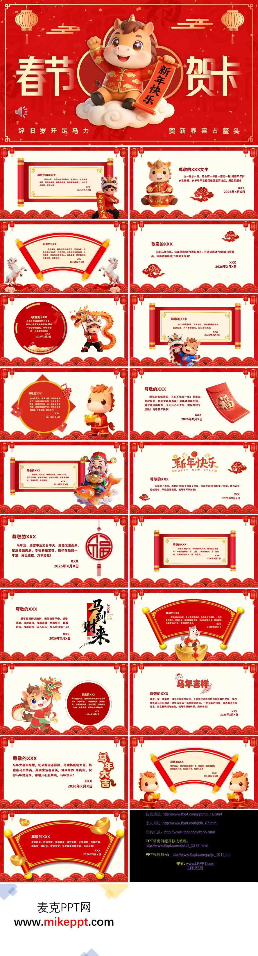 这是一套为 2026 马年春节精心设计的贺卡素材集 PPT,主题为“辞旧岁开足马力 贺新春喜占鳌头”,整体风格采用红金配色,搭配卡通马形象、灯笼、祥云等传统元素,营造出浓郁的新春氛围,为用户提供了丰富的个性化祝福选择。 PPT 内含多种适配不同对象的贺卡模板,满足多样化的祝福需求。其中,针对先生和女士的贺卡设计温馨雅致,适合表达岁末的温情与关怀;面向小朋友的贺卡则采用可爱风格,充满童趣与活力;而赠予长辈的贺卡则庄重典雅,传递出对长辈的敬意与新春的吉祥祈愿。此外,还有适用于朋友、同事等不同关系的模板,每款都融入了马年“开足马力”的生肖特质,寓意新年奋发向前、事业蓬勃。 在模板形制上,PPT 提供了卷轴、扇形、圆形等多种传统样式,每张贺卡都预留了落款位置,并统一标注了“2026 年 X 月 X 日”的日期,方便用户根据具体需求进行个性化调整。祝福语也根据不同关系进行了贴心设计:对亲友是岁末的温情叮咛,对长辈是新春的吉祥祈愿,对伙伴则是事业蓬勃的祝福,确保每一份祝福都能精准传达心意。 整套 PPT 是春节制作个性化祝福贺卡的实用素材包,不仅设计精美、风格多样,还具备很强的适配性和便捷性。无论是家庭聚会、朋友相聚还是商务往来,都能快速找到合适的模板,为您的新春祝福增添一份独特的温暖与美好。