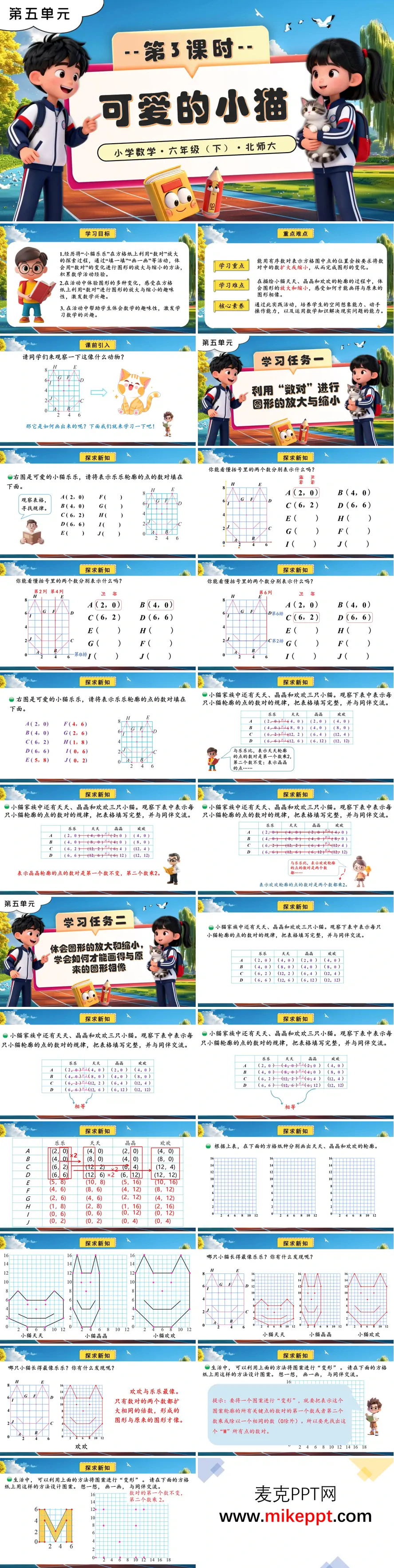 这是一套北师大版六年级下册数学“可爱的小猫”第3课时的教学PPT,围绕“用数对进行图形的放大与缩小”展开教学,通过生动的情境和丰富的操作活动,帮助学生深入理解图形缩放的数学原理。 PPT开篇明确了本课的学习目标,即让学生通过实际操作经历用数对放大图形的过程,感受图形缩放的趣味性。同时,指出本课的重难点是用数对表示方格中点的位置,并按要求放大或缩小图形,掌握图形缩放后保持相似的条件。 教学流程从“课前引入”开始,通过展示小猫的方格图案轮廓,引导学生观察并思考如何用数对表示图形的位置,从而引出数对绘图的主题。这一环节通过生动的情境激发学生的学习兴趣,为后续探究奠定基础。 在“探究新知”环节,PPT分三步展开。第一步,引导学生填写小猫乐乐轮廓的数对,帮助学生理解数对的含义及其在方格中的具体表示方法。第二步,通过观察小猫天天、晶晶、欢欢的数对变化,学生逐步总结出规律:当数对中的两个数同时乘以或除以相同的非零数时,图形会放大或缩小,且与原图形保持相似;而如果只对一个数进行乘或除操作,图形的形状则会发生改变。这一环节通过对比和归纳,帮助学生深入理解数对变化与图形缩放之间的关系。 在“达标练习”环节,PPT设计了正方形、长方形的缩放练习以及小鱼轮廓的数对练习,通过多样化的练习巩固学生对图形缩放规律的理解和应用。这些练习不仅加深了学生对知识的掌握,还培养了他们的动手操作能力和空间思维能力。 最后,在“知识总结”环节,PPT明确指出图案变形的规则:数对同时缩放相同的数时,图形的形状不变,大小改变;而只缩放一个数时,图形的形状和大小都会发生改变。这一总结帮助学生系统梳理本课所学知识,强化对图形缩放原理的理解。 整套PPT以“可爱的小猫”为情境载体,将抽象的数学知识与生动的情境相结合,通过操作、探究和练习,引导学生逐步掌握图形缩放的数学原理。这种教学设计不仅激发了学生的学习兴趣,还培养了他们的自主探究能力和数学思维能力,是一套实用且富有启发性的教学材料。