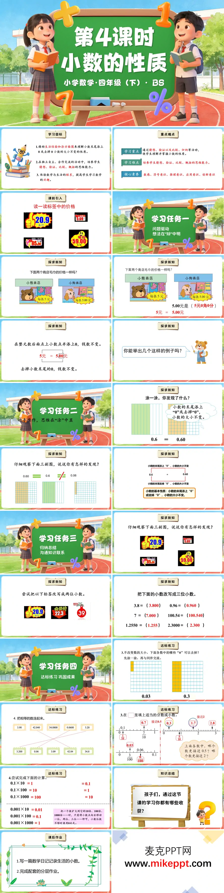 这份四年级下册“小数的性质”课件以“生活对比—动手验证—归纳总结—灵活应用”四步递进,借助价格标签、涂方格和多样化练习,让学生在“看、画、想、说”中经历猜想、验证、归纳的完整过程,真正理解“小数末尾添0或去0,大小不变”的本质。开篇用“小熊商店5元 vs 小狗商店5.00元”的毛巾价格对比激趣,学生肉眼发现“价格一样”,教师追问“5元和5.00元为什么相等”,自然引出“末尾0”的探究主题。 验证环节用“涂方格”双轨活动:①左侧涂0.6(6小格),右侧涂0.60(60小格=6条),动画把0.60的“0”一格格消失,学生眼见“面积不变”,初步建立“0.6=0.60”的表象;②再对比0.60与0.06,强调“末尾”与“非末尾”的差异,用颜色高亮“末尾0”,顺势板书性质:小数末尾添上或去掉0,大小不变,并配“末尾”关键词闪烁,突破“关键位置”难点。 归纳后用“改写游戏”巩固:把0.7→0.70,0.700→0.7,学生用“末尾橡皮”动画拖拽0,系统即时判断“是否位于末尾”,强化“只动末尾”的规则;再通过“0的取舍”判断、相等小数连线、分数与小数互化等分层练习,渗透“化简”与“统一位数”的双重价值。 达标练习层层递进:①判断——哪些0可以去掉;②连线——相等小数配对;③互化——分数→末尾添0小数;④探究——小数点移动与末尾0关系,均选自期末真题,学生先独立作答,再小组互评“是否只动末尾”,系统实时统计正确率,教师针对“非末尾0误删”“移动小数点混淆”再示范,确保“会判断、会改写、会应用”全程过关。 总结用“一张性质卡”收束:末尾添0去0,大小不变;非末尾0,一动就变,学生用便利贴写下“最得意的一次改写”贴于展板,形成班级“性质智慧墙”;自我评价从“我敢猜想、我会验证、我肯应用”三面点赞,小组互评贴星星,让知识、情感双提升。 整份课件用“价格对比—涂格验证—动画改写—分层应用”四连击,把小数性质从“机械去0”升级为“会找末尾、会化简、会统一”的数感技能,既突破“末尾关键”难点,又培养推理与优化意识,为后续学习小数大小比较、四则运算及近似数奠定坚实的性质基础。