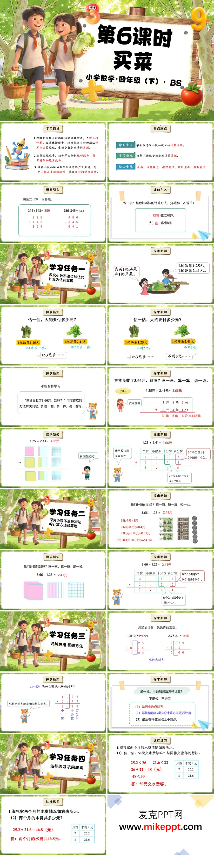 这份四年级下册“买菜”主题课件把“小数不进位加、不退位减”嵌入真实的买菜情境,依照“估算—探究—归纳—应用”四步,引导学生在“元角分”的拆分、画图和竖式对比中理解“小数点对齐就是数位对齐”的算理,培养估算、迁移和运算能力。课堂从整数加减竖式热身出发,教师迅速抛出“买油菜1.25元、芹菜2.41元,一共多少钱”的生活问题,学生先用“元+元、角+角、分+分”的拆分法口算估算,得出“大约3.6元”的范围,再用1:1元角分学具板摆出1.25+2.41,直观看到“5分+1分=6分,2角+4角=6角,1元+2元=3元”,教师同步在屏幕上把“元、角、分”与“个位、十分位、百分位”一一对应,顺势抽象出竖式:小数点对齐,按整数加法计算,得数点小数点,减法验算3.66-1.25同理,归纳出“三句口诀”:点对齐、位相同、得数点小数点。 达标练习采用“生活三套餐”:①估算—水费单大约多少钱;②竖式—跳远成绩2.14米-1.85米;③口算—身高1.42米+0.06米,均选自期末真题,学生先独立用竖式或口算,再小组互评“小数点对齐是否规范”,系统实时统计正确率,教师针对“小数点漏写”“相同数位未对齐”再示范,确保“会算、会估、会说”全程过关。 总结用“一张算法卡”收束:点对齐、位相同、得数点小数点,学生用便利贴写下“最得意的一次口算”贴于展板,形成班级“计算智慧墙”;自我评价从“我敢估算、我会对齐、我肯检查”三面点赞,小组互评贴星星,让知识、情感双提升。 整份课件用“生活情境—元角分拆分—竖式抽象—真题应用”四连击,把小数加减从“机械对齐”升级为“会估算、会拆、会对齐”的迁移能力,既突破“小数点对齐”难点,又培养数感和运算意识,为后续进位、退位小数加减及小数四则混合运算奠定坚实而有趣的基础。