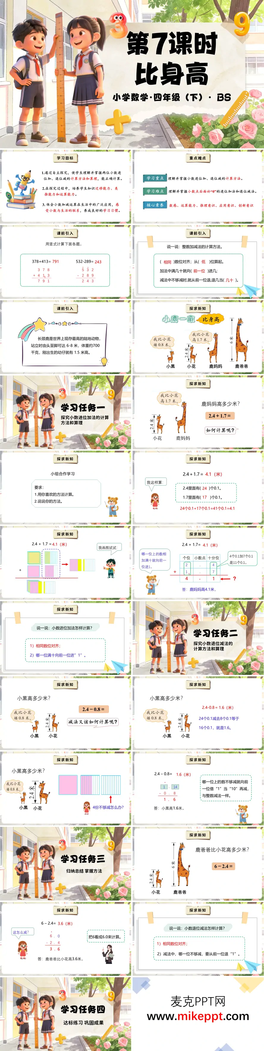 这份四年级下册“比身高”课件以“长颈鹿一家身高差”为情境主线,依照“复习铺垫—情境探究—方法归纳—分层应用”四步展开,引导学生在“计数单位拆分—画图演示—竖式抽象”的多元体验中,掌握小数进位加法和退位减法的算理与算法,突破“小数点后补0退位”的难点,培养数感和运算能力。开篇用整数进退位竖式抢答唤醒旧知,教师随即抛出“鹿妈妈比小花高1.7米”的问题,学生先用“2米4厘米+1米7厘米”的复名数拆分口算,再用面积模型涂出2.4+1.7:把1个正方形平均分成10份,2.4涂24份,1.7涂17份,合起来41份=4.1,直观看到“十分位满10向个位进1”;竖式同步演示“小数点对齐,满10进1”,归纳出“相同数位对齐,进退位规则与整数一致”。 退位环节用“小黑比小花矮0.8米”突破2.4-0.8:画图去掉8份,剩16份=1.6,强调“十分位4减8不够,向个位借1”;再用“鹿爸爸比小花高多少米”突破6-2.4的补“0”难点,动画在6后添0写成6.0,演示“十分位0减4不够,向个位借1”,学生眼见“补0保持数位对齐”,教师顺势总结“补0不退位”口诀。 达标练习层层递进:①画图计算——用十格条表示2.3+1.9;②竖式运算——4.5-2.7;③小数性质应用——把6写成6.0再减,均选自期末真题,学生先独立用竖式,再小组互评“进退位标记是否规范”,系统实时统计正确率,教师针对“补0漏写”“借位后未减1”再示范,确保“会画图、会竖式、会补0”全程过关。 总结用“一张算法卡”收束:小数点对齐,满10进1,不够借1,补0对齐,学生用便利贴写下“最得意的一次竖式”贴于展板,形成班级“计算智慧墙”;自我评价从“我敢画图、我会进位、我肯补0”三面点赞,小组互评贴星星,让知识、情感双提升。 整份课件用“情境激趣—画图演示—竖式抽象—真题巩固”四连击,把小数进退位加减从“机械对齐”升级为“会借位、会补0、会验算”的迁移能力,既突破“补0退位”难点,又培养运算意识和数感,为后续小数四则混合运算及解决实际问题奠定坚实而有趣的基础。