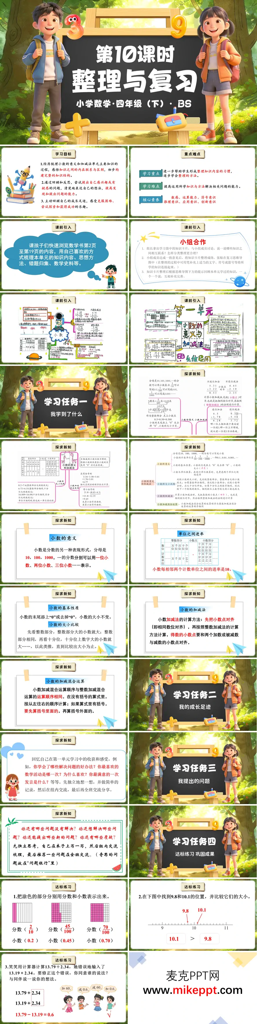 这份四年级下册“小数的意义和加减法”单元整理与复习课件,以“浏览教材—合作整理—导图建构—反思提升”四步递进,引导学生在自主梳理、合作交流与真题应用中,把散落的知识点织成网、把易错点变成提分点,真正体验到“整理有方法、复习有乐趣”。开篇用“浏览教材+小组合作”唤醒记忆:学生快速翻阅课本,用彩色便利贴标记关键词,再分组把知识卡片贴在黑板上,教师即时生成“学生版思维导图”,顺势梳理六大核心:小数意义、基本性质、单位换算、大小比较、进退位加减、混合运算,一目了然锁定复习范围。 “成长足迹”让学生写下“我最得意的一次小数计算”,“提出问题”环节则鼓励学生把仍感困惑的疑问贴在“问题树”上,教师现场归类,既反思又生成新的学习资源。 达标练习采用“闯关赛”:①互化—分数与小数对口令;②数线—在0-1上标出0.25、0.3并比较;③纠错—找出竖式中“小数点未对齐”的错误;④混合运算—递等式计算5.6+3.25-2.1;⑤找规律—0.1,0.2,0.4,( );⑥综合应用—自行车车架长度比较、行程时间规划、购物预算比价,均选自期末真题,学生先独立闯关,再系统实时统计正确率,教师针对“补0退位”“混合运算顺序”再示范,确保“会算、会比、会解决”全程过关。 最后布置“自主命题”或“数学日记”:让学生仿照期末卷出3道小数应用题并附答案,或记录本周用小数解决的生活趣事,实现“从做题到命题、从课堂到生活”的升华。 总结用“一张思维导图”收束:意义→性质→换算→比较→加减→应用,学生用便利贴写下“最想提醒同学的易错点”贴于展板,形成班级“复习智慧墙”;自我评价从“我会整理、我会提问、我肯应用”三面点赞,小组互评贴星星,让知识、情感双提升。 整份课件用“合作整理—问题生成—闯关检测—自主命题”四连击,把单元复习从“教师总结”升级为“学生自编、自用、自评”的探究历程,既培养知识整理与反思能力,又渗透创新与应用意识,为后续学习更复杂小数运算及解决实际问题奠定坚实而有趣的习惯与能力基础。