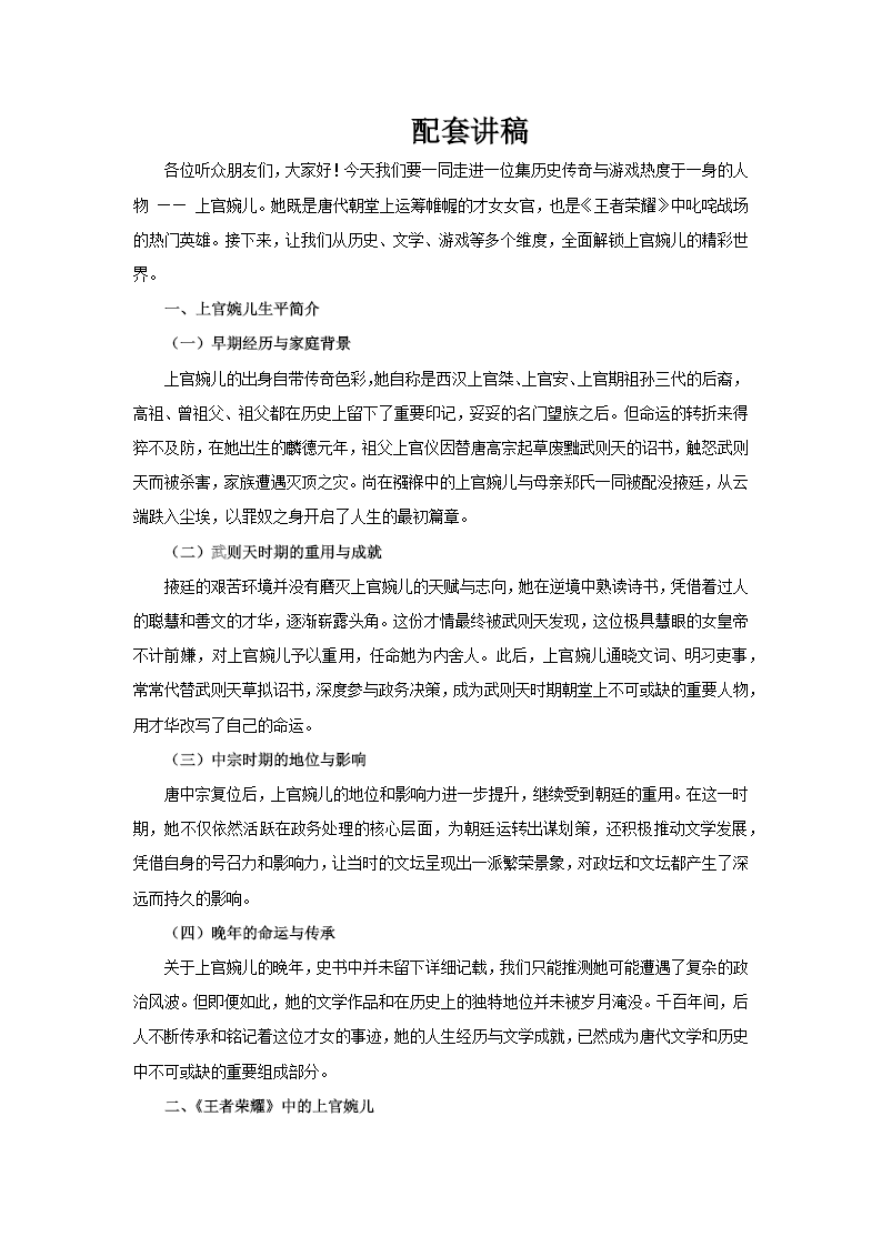 本套 PPT 以“上官婉儿”为主题,从历史与现代的多重视角展开全面而深入的解析,内容丰富且维度多元,全方位展现了上官婉儿的传奇一生及其深远影响。 PPT 开篇从上官婉儿的生平简介入手,追溯其名门出身与家族变故,详细梳理了她在武则天和中宗时期的政治与文学成就,以及晚年的命运波折和文化传承,为后续内容奠定了坚实的历史基础。 随后,PPT 转向现代视角,聚焦于《王者荣耀》中的上官婉儿角色。介绍了她在游戏中的英雄定位、独特的技能机制、皮肤设计理念,以及玩家在实战中的实用技巧,生动展现了上官婉儿在现代游戏文化中的全新形象。 接着,PPT 深入探讨上官婉儿的文学贡献,分析其诗歌创作风格与散文作品的影响,将其与李清照等才女进行对比,并阐述她对后世文学发展的启示,凸显了她在文学史上的重要地位。 此外,PPT 还解析了上官婉儿的历史地位,探讨她对唐代女性地位的推动作用、后世评价的演变,以及在现代文化中的符号化呈现,展现了她作为历史人物的多面性。 PPT 亦不避讳争议,深入探讨了上官婉儿的传奇故事,如她与武三思的复杂关联以及在政治斗争中的艰难抉择,还原了一个立体而真实的历史人物形象。 最后,PPT 总结上官婉儿的多重身份——既是才华横溢的历史才女,也是现代游戏中的热门 IP,并探讨了她对当代的启示,鼓励人们从历史与现代的交融中汲取智慧与力量。 整套 PPT 通过历史、文学、游戏等多个维度的串联,立体呈现了上官婉儿的多元形象与深远影响,为观众带来了一场跨越时空的文化盛宴,启发人们从不同视角重新审视这位传奇女性。