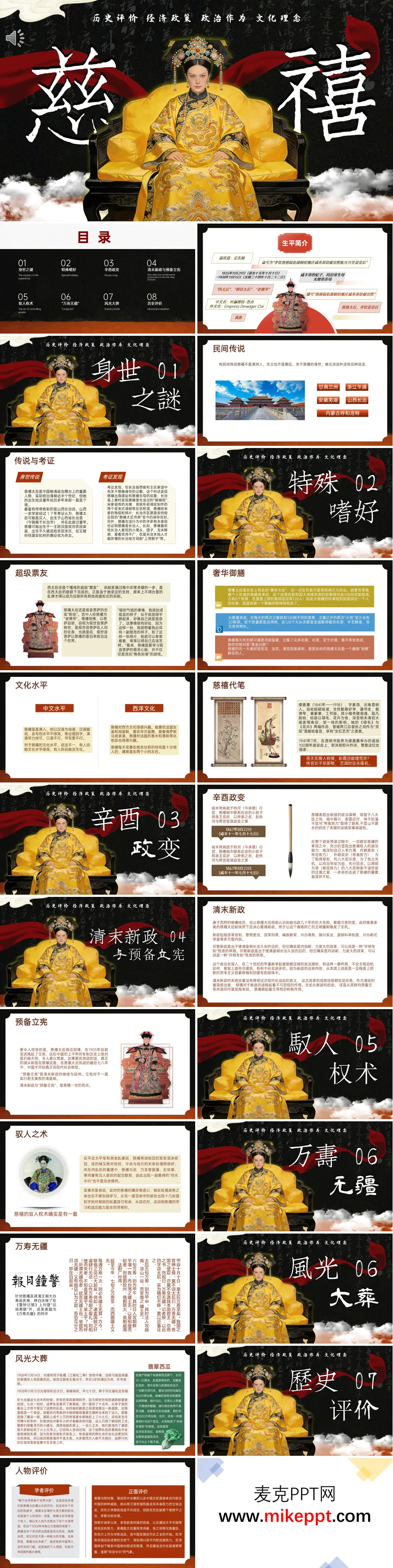 本套 PPT 以“慈禧”为主题,从多维度展开深入解析,全面呈现了这位晚清重要人物的生平、政治作为以及历史评价,为了解相关历史提供了丰富的综合信息。 PPT 首先聚焦于慈禧的生平维度,深入探讨了她的身世之谜。通过对比民间传说与史料考证,揭示了慈禧的出身背景及其在历史记载中的争议。同时,PPT 还细致介绍了慈禧的特殊嗜好,例如她奢华御膳的规格,展现了她作为晚清宫廷女性的奢华生活。此外,还提及了她的文化水平以及代笔情况,从侧面反映了她个人的学识与能力。 接着,PPT 梳理了慈禧的政治轨迹,详细介绍了辛酉政变的核心过程,展现了她在权力斗争中的策略与手段。同时,对清末新政与预备立宪的实施举措进行了系统阐述,分析了她在晚清政治变革中的角色与影响。此外,PPT 还深入探讨了慈禧的驭人权术特点,揭示了她如何通过各种手段掌控晚清政权。 在生活细节方面,PPT 展示了慈禧万寿庆典的排场,如报时金钟等奢华细节,以及她风光大葬的具体情况,从侧面反映了她生前的权力与地位。 最后,PPT 以历史评价收尾,从正反两面总结了学界与大众对慈禧的不同看法。通过梳理各方观点,展现了慈禧复杂的历史形象,帮助观众全面理解她在晚清历史中的多面性。 整套 PPT 从个人细节到政治举措,再到后世评价,立体呈现了慈禧的多面性,是了解晚清历史的重要参考材料。