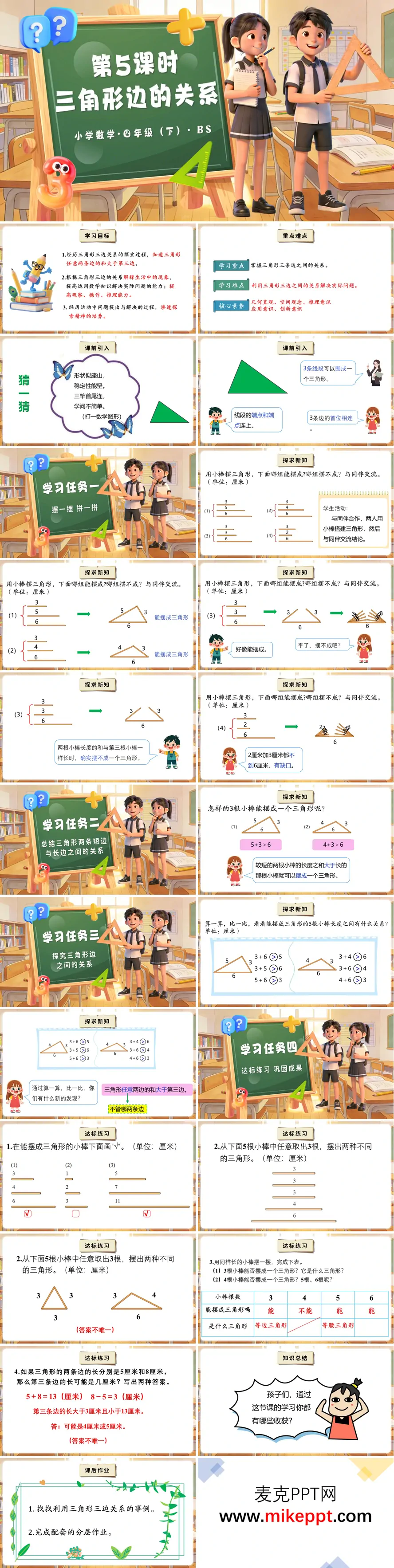 这份“三角形边的关系”第5课时课件,以“猜谜+疑问”激趣,带领学生经历“动手摆—直观比—归纳规律—生活应用”的完整探究链条,在“小棒实验”中发现并掌握“任意两边之和大于第三边”的核心性质。课堂分四大学习任务层层推进:先让学生用不同长度的小棒自由组合,发现“有的能摆成三角形,有的却摆不成”,初步感知三边长度存在某种“门槛”;再通过对比“能”与“不能”的数组,引导学生用“较短两根之和与最长边比较”的方式,得出“短两边之和必须大于最长边”的初步结论;随后用更多数组验证,最终提炼出“三角形任意两边之和大于第三边”的普适规律,并用“大于”符号式表达,完成从感性到理性的跨越。 达标练习采用“实验四挑战”:①判断给定三根小棒能否围成三角形;②从多根小棒中选出能围成三角形的组合;③填表探究不同根数小棒的组合情况;④已知两边求第三边可能长度的范围,均选自期末真题,学生先独立用“两边和>第三边”判断,再小组互评“理由是否充分”,系统实时统计正确率,教师针对“等于也围不成”“范围写不全”再示范,确保“会判断、会选组、会求范围”全程过关。 总结用“一张关系式”收束:a+b>c,a+c>b,b+c>a,学生用便利贴写下“最得意的一次判断”贴于展板,形成班级“关系智慧墙”;自我评价从“我敢实验、我会判断、我肯应用”三面点赞,小组互评贴星星,让知识、情感双提升。 整份课件用“实验激趣—对比归纳—验证提升—生活应用”四连击,把“三边关系”从“能摆成”升级为“会推理、会求范围”的空间能力,既培养动手操作与逻辑推理,又渗透几何直观与模型思想,为后续学习三角形面积、周长及综合实践奠定坚实的探究与思维基础。