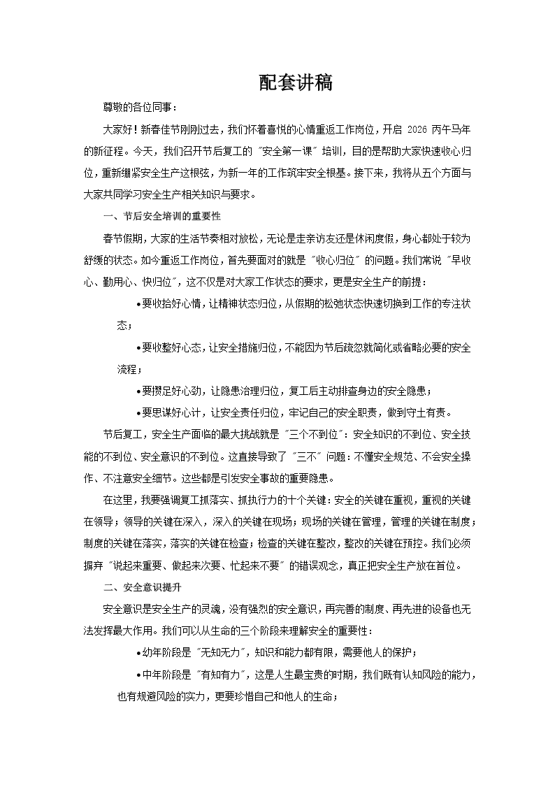 本套 PPT 是 2026 年丙午马年春节后复工安全培训材料,以“节后复工安全第一课”为主题,系统地分为五大模块,全面覆盖复工安全的各个方面,旨在帮助员工快速调整状态,筑牢安全防线,确保节后生产的安全有序。 PPT 的第一部分着重强调培训的重要性,指出节后复工时员工需要迅速收心归位,明确安全意识、技能和责任不到位等潜在风险,凸显安全在复工初期的核心地位,为后续内容奠定基础。 第二部分聚焦于提升安全意识,从生命和家庭的维度诠释安全的价值,解析风险、暴露和伤害之间的关联,引导员工主动规避不安全状态,增强对安全重要性的内在认知。 第三部分展开安全知识学习,定义安全的基本概念,细分事故类型,拆解人的不安全行为、麻痹和侥幸等不安全心理,以及管理缺陷等问题,帮助员工从理论层面理解安全风险的成因。 第四部分聚焦安全技能的掌握,涵盖火灾常识、灭火器使用、应急处置等实操技能,通过具体的操作流程和案例分析,确保员工在面对突发情况时能够迅速、正确地应对。 最后,PPT 明确了安全法律法规,梳理了企业和员工的安全权利、义务及合规要求,强调依法依规操作的重要性,确保员工在日常工作中做到知法守法。 整套 PPT 作为复工安全的实用指导手册,不仅强化了员工的安全意识,还通过具体的操作技能和法律法规的讲解,确保安全措施落地有声,助力企业节后复工的安全有序,为新一年的安全生产保驾护航。