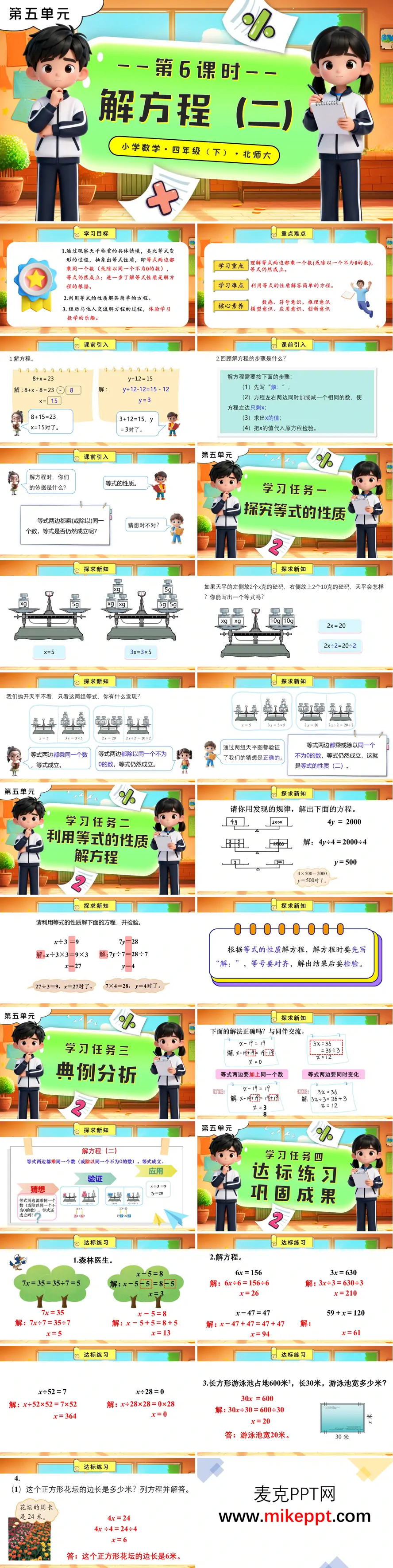 本套 PPT 是北师大版四年级下册数学 “解方程(二)” 第 6 课时的课件,主要围绕 “等式的性质(二)及解方程” 这一核心内容展开教学。课件以 “解方程回顾” 作为课前引入,帮助学生复习等式性质(一)以及解方程的基本步骤,为后续学习做好铺垫。 在核心教学环节中,课件借助天平称重的情境,通过直观演示引导学生探究等式的性质(二),即 “等式两边同时乘或除以同一个不为 0 的数,等式仍然成立”。这一过程不仅激发了学生的学习兴趣,还帮助他们从直观现象中抽象出数学规律。随后,课件指导学生运用这一性质解决 “ax=b” 和 “x÷a=b” 型方程,并强调解方程的规范流程:写解、对齐等号、检验答案,帮助学生养成良好的解题习惯。 为了进一步巩固学生的学习成果,课件通过典例分析,纠正解方程过程中常见的错误,帮助学生避免易错点。在达标练习环节,课件设计了多样化的练习题,包括 “森林医生” 纠错、解方程以及运用方程解决长方形、正方形的周长和面积等实际问题。这些练习题不仅检验了学生对等式性质的理解,还强化了他们解方程的实操能力,同时培养了学生运用数学知识解决实际问题的能力。 整个课件以 “猜想 - 验证 - 应用” 的逻辑顺序展开,结合直观的天平演示和分层练习,既落实了等式性质的理解,又强化了解方程的实操与应用。这种教学设计贴合四年级学生的认知节奏,能够有效帮助学生在理解数学概念的同时,提升解题能力和数学思维水平。