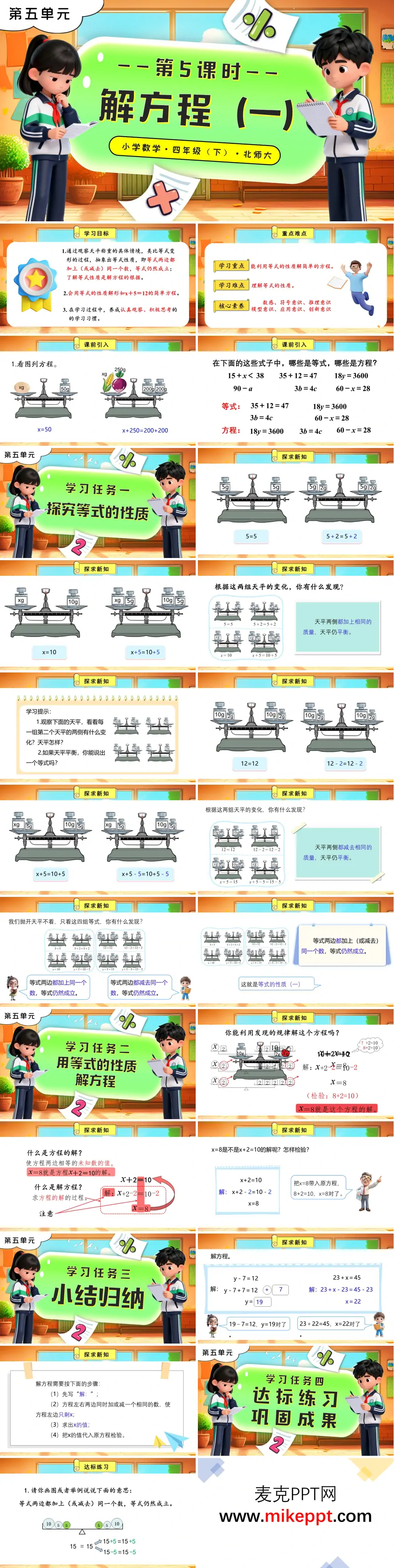 本套 PPT 是北师大版四年级下册数学 “解方程(一)” 第 5 课时的课件,专注于 “等式的性质(一)与解简单方程” 的教学内容。课件以 “看图列方程、区分等式与方程” 作为课前引入环节,巧妙地衔接了学生已有的知识基础,为新知识的学习做好铺垫。 在核心教学部分,课件通过天平称重的直观演示,引导学生探究并总结出等式的性质(一):即等式两边同时加上(或减去)同一个数,等式仍然成立。这一过程借助天平模型的动态演示,将抽象的数学概念具象化,帮助学生更直观地理解等式性质的本质。随后,课件指导学生运用这一性质解决 “x±a=b” 型方程,明确解方程的规范流程:写解、等号对齐、求解、检验,并通过对比辨析,帮助学生清晰区分 “方程的解” 和 “解方程” 这两个易混淆的概念。 在巩固环节,课件通过小结归纳解方程的步骤,进一步强化学生对解题流程的理解。达标练习部分设计了丰富多样的题型,包括对等式性质的直观解释、看图列方程、解方程等,同时结合实际应用场景,帮助学生将所学知识灵活运用到实际问题中,提升数学思维和应用能力。 整套课件以 “直观演示 - 规律总结 - 实操应用” 为逻辑主线,借助天平模型降低数学概念的抽象性,既夯实了学生对等式性质的理解,又强化了解方程的规范操作与实际应用能力。这种教学设计充分契合四年级学生的认知特点,能够有效激发学生的学习兴趣,帮助他们在轻松愉快的氛围中掌握数学知识,提升数学素养。