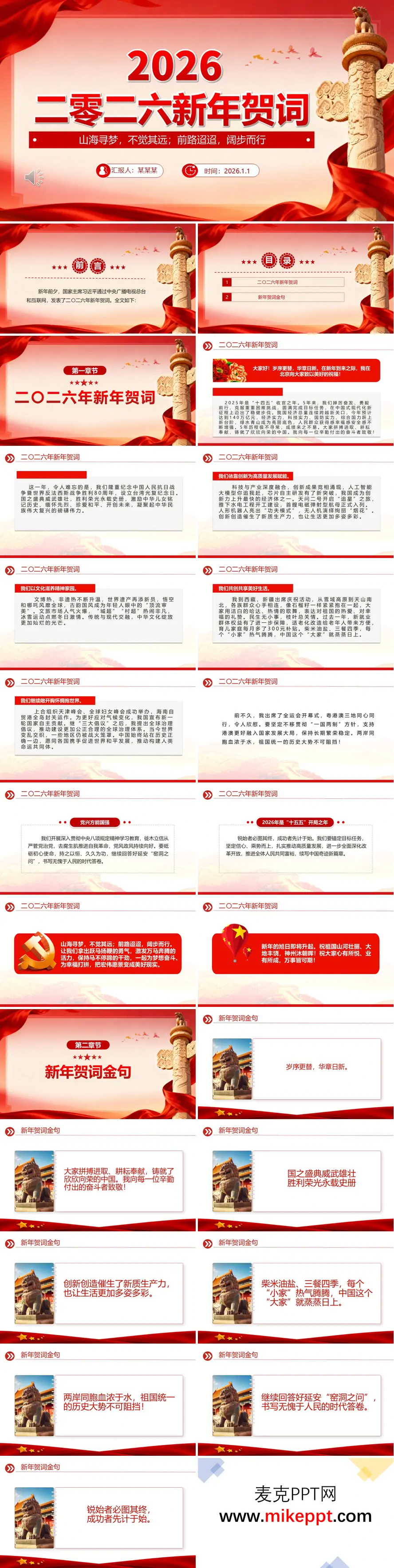这份新年贺词PPT以“山海寻梦,不觉其远;前路迢迢,阔步而行”为主题,整体结构清晰,内容层层递进,既回顾了过去五年的发展成就,也展望了“十五五”开局之年的新征程。 PPT开篇以岁序更替、华章日新引入,重点总结了“十四五”期间我国在经济总量、科技创新、生态环境及民生福祉等方面取得的显著成绩,强调五年历程极不寻常,成绩来之不易。随后通过纪念抗战胜利80周年、设立台湾光复纪念日等内容,突出国家记忆与民族凝聚力的重要意义。 在创新发展方面,PPT展示了人工智能、芯片研发、航天工程、重大基建等领域的突破,体现了科技与产业深度融合带来的新质生产力。同时,文博热、非遗传承、国风文化等内容展现了文化自信的提升,而民生改善、民族团结等内容则突出了“小家”与“大家”共同发展的理念。 在国际部分,PPT强调中国继续扩大开放,积极参与全球治理,提出全球治理倡议,推动构建人类命运共同体。在结尾部分,通过“窑洞之问”强调党的自我革命,并号召全民保持干劲、共创未来。最后以“山河壮丽、万事可期”的祝福收尾,整体内容鼓舞人心、结构完整,兼具总结性与展望性。