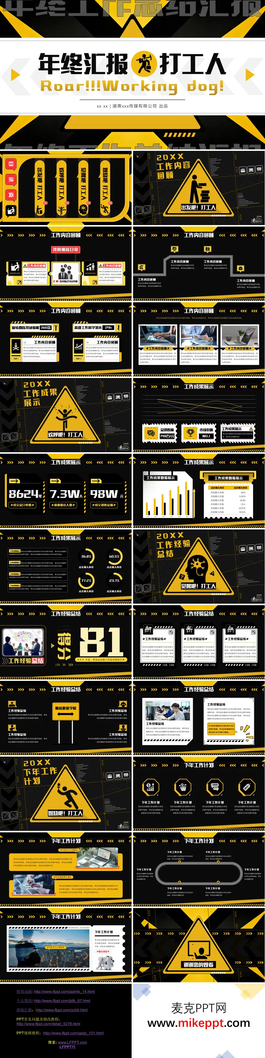 这套PPT以“年终汇报打工人”为主题,风格鲜明、语言活泼,围绕“搬砖日常”展开,整体结构分为工作内容回顾、工作成果展示、经验总结与下年计划四部分。 在工作内容回顾部分,文档通过多组“单击此处编辑内容”的提示框,配合“BANZHUAN”等醒目标题,生动呈现了日常工作的模块化记录方式,强调了对任务执行过程的梳理与复盘意识。 工作成果展示环节则通过数据可视化强化说服力,如“8624笔成交订单”“7.3万新增粉丝”“9亿元成交金额”等核心指标突出业绩亮点。同时搭配表格与百分比图示,清晰呈现各项任务完成率、工作时长、团队规模等细化数据,体现成果的多元维度。 经验总结部分以文字框结合图示的形式,引导对工作方法、团队协作、问题解决等层面的深度反思,突出“成长”与“优化”导向。 下年计划以“立个小目标”“划水摸鱼两不误”等趣味表述弱化传统汇报的严肃感,通过分点列明目标与执行路径,搭配“WORKING SCHEME”等视觉标签,既体现规划的专业性,又保留了个性化表达空间。 整体来看,这套PPT内容框架清晰、视觉元素丰富,通过数据、图表与文案的有机结合,既系统展示了年度工作全貌,又以轻松幽默的语调增强了汇报的感染力,符合当下职场年轻群体的表达习惯。