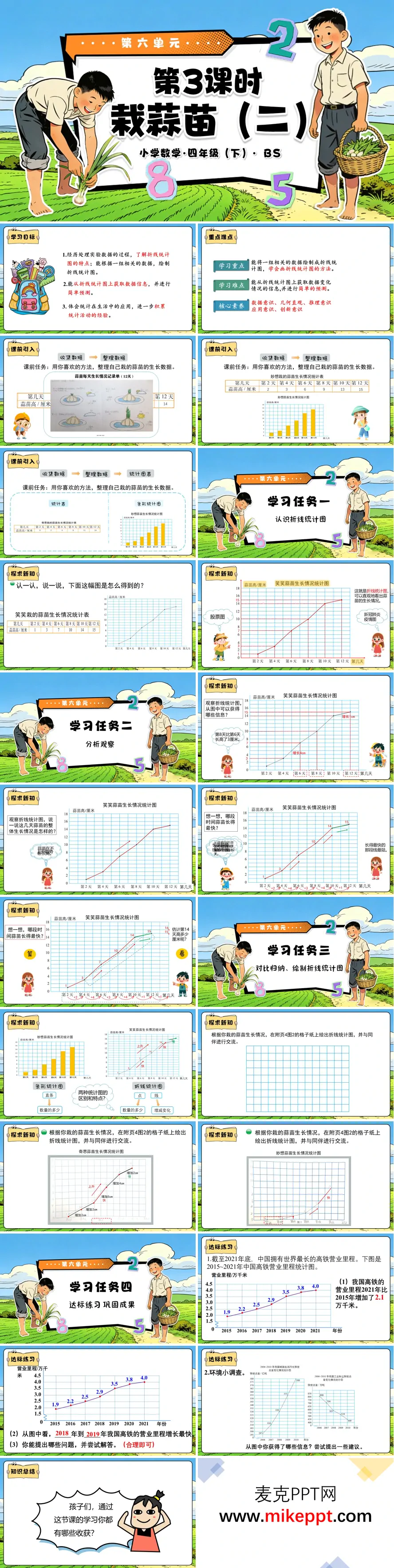 这两课时课件以“真实数据+亲身实践”为主线,带领学生完成从“小数据一格一人”到“大数据一格多单位”的统计进阶。第一课时“生日”用谜语点燃兴趣,通过举手、写纸条收集班级四季生日人数,现场画“正”字记录,再引入横向条形图:横轴人数、纵轴季节,1格=1人,学生亲手涂色便发现“春天生日最多”,体会条形图“一眼比大小”的直观优势;练习跳出生日,延伸到体育、图书、电视节目偏好调查,把“收集—绘图—分析”三步法练熟。第二课时“栽蒜苗(一)”衔接实践活动:各组汇报14天蒜苗高度,当数据出现28cm、30cm时,学生发现“1格1cm不够画”,自然引出新知——1格表示多个单位;通过讨论“1格=2cm、5cm还是10cm”,学生体会“合适单位”要兼顾数据大小、图纸空间和阅读便利,随后用鸡场卖蛋、家务劳动等大数据场景,让学生再次经历“选单位—画条—比量”的完整过程,巩固较大数据的统计与解读。两课时用“生日小调查—蒜苗大数据—生活再拓展”的链条,把统计意识、选单位策略和数据分析能力层层落实,课后延伸让学生回家调查家人最喜欢的水果并绘制一格多单位条形图,实现课堂到生活的无缝迁移,真正培养“用数据说话”的数学素养。