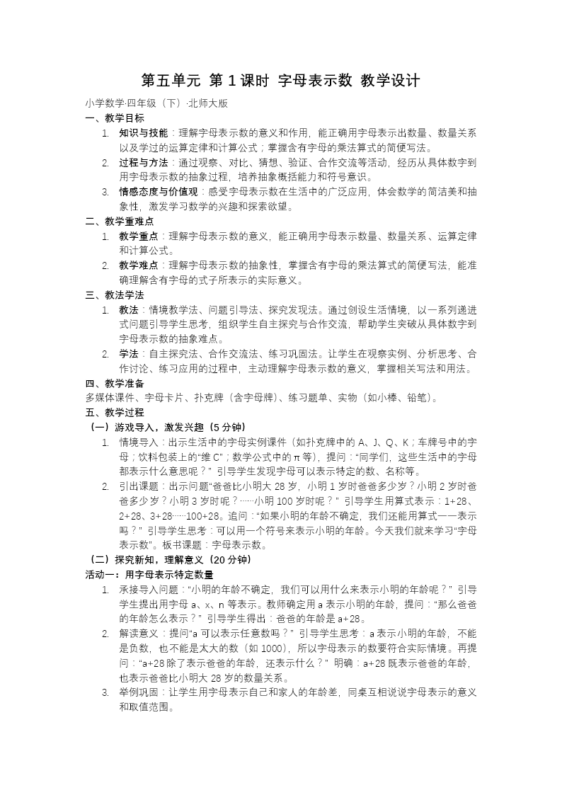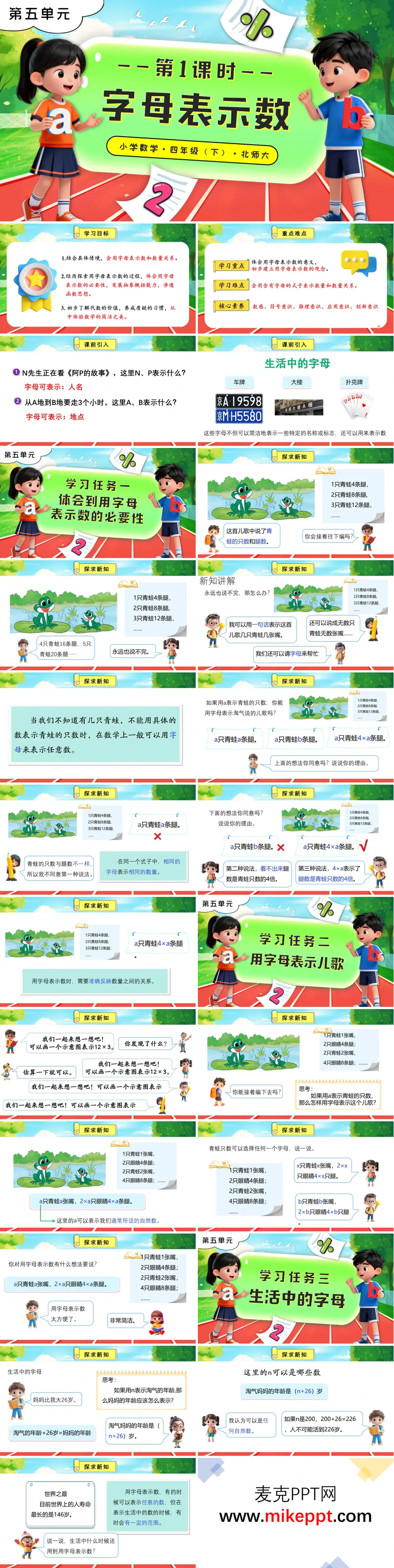 本套 PPT 是北师大版四年级下册数学 “字母表示数” 第 1 课时的课件,主要围绕 “用字母表示数及数量关系” 展开教学。课件以 “生活中字母表示人名、地点” 作为课前引入,通过学生熟悉的日常情境,自然地将字母引入数学学习,帮助学生建立字母与数学之间的联系。 在核心教学环节,课件通过四个任务逐步推进。首先,借助 “青蛙儿歌” 情境,引导学生体会用具体数字无法穷尽所有情况时,字母表示任意数的必要性。例如,通过 “a 只青蛙有 4×a 条腿” 的表达,学生能够明确字母表示数需要精准反映数量关系,从而初步感受字母的概括性和简洁性。接着,通过用字母表示 “青蛙嘴、眼、腿” 的儿歌,进一步巩固学生对含字母式子的理解和应用,帮助学生在趣味情境中加深对字母表示数的认识。 随后,课件结合 “淘气与妈妈的年龄” 的实际问题,说明在用字母表示生活中的数时,字母的取值范围可能会受到限制。这一环节帮助学生理解字母表示数并非完全抽象,而是与实际情境紧密相关,进一步深化学生对字母表示数的理解。最后,在达标练习部分,通过用字母表示梅花瓣数、周数、手指数量等多样化的练习,强化学生对字母表示数的应用能力,帮助学生在不同情境中灵活运用所学知识。 整套课件以 “生活情境→问题冲突→字母表示→实际应用” 为逻辑主线,借助儿歌、年龄等具象场景,让学生在生动有趣的学习过程中,逐步理解字母表示数的简洁性与概括性。这种教学设计充分契合四年级学生的认知特点,能够帮助学生在轻松愉悦的氛围中,初步建立起用字母表示数的数学思维,为后续学习代数知识奠定坚实基础。