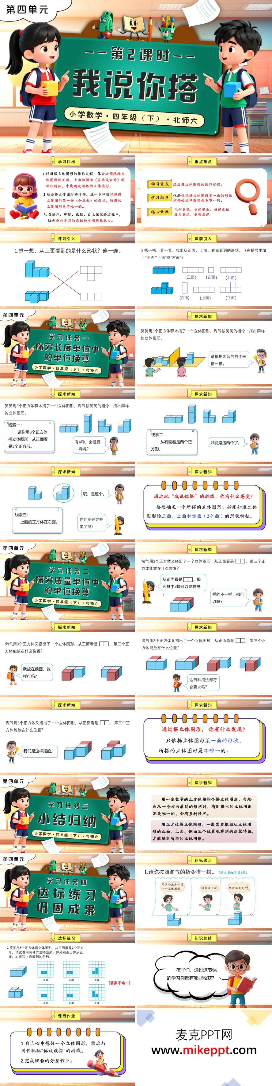 本套 PPT 是北师大版四年级下册数学 “我说你搭” 第 2 课时的课件,主要围绕 “根据视图特征搭立体图形” 展开教学。课件以 “辨认立体图形的正、上、侧面” 作为课前引入,通过复习旧知,帮助学生快速进入学习状态,为后续学习做好铺垫。 在核心教学环节,课件通过 “我说你搭” 游戏展开。首先,以 “用 3 个正方体,根据‘正面 3 个正方形→右面 2 个正方形→上面正方体在右面’的线索搭图形” 为例,引导学生在实际操作中逐步得出结论:确定一个立体图形需要结合正、上、侧三个面的形状。这一过程不仅培养了学生的动手能力,还帮助他们理解多视图组合的重要性。接着,通过 “正面是 2 个正方形时,第 3 个正方体的摆放位置” 的探究,让学生体会仅靠一个面的形状,搭出的立体图形可能有多种可能性,从而进一步理解多视图的必要性。 在教学过程中,课件总结出搭立体图形的规律:单一面的形状对应多种搭法,而三个面的形状才能确定唯一的立体图形。这一规律的总结帮助学生建立起系统的思维模式,使他们在面对类似问题时能够迅速找到解决方案。最后,通过达标练习,进一步巩固学生的技能,强化空间想象能力,帮助学生在多样化的练习中提升对三维空间的理解。 整套课件以 “游戏操作 - 规律探究 - 练习巩固” 为逻辑主线,借助互动情境让学生直观感知 “二维视图” 与 “三维立体” 的对应关系。这种教学设计充分契合四年级学生的认知特点,能够有效激发学生的学习兴趣,帮助他们在动手操作和思维训练中逐步提升空间想象能力和几何直观能力,为后续学习几何知识奠定坚实基础。