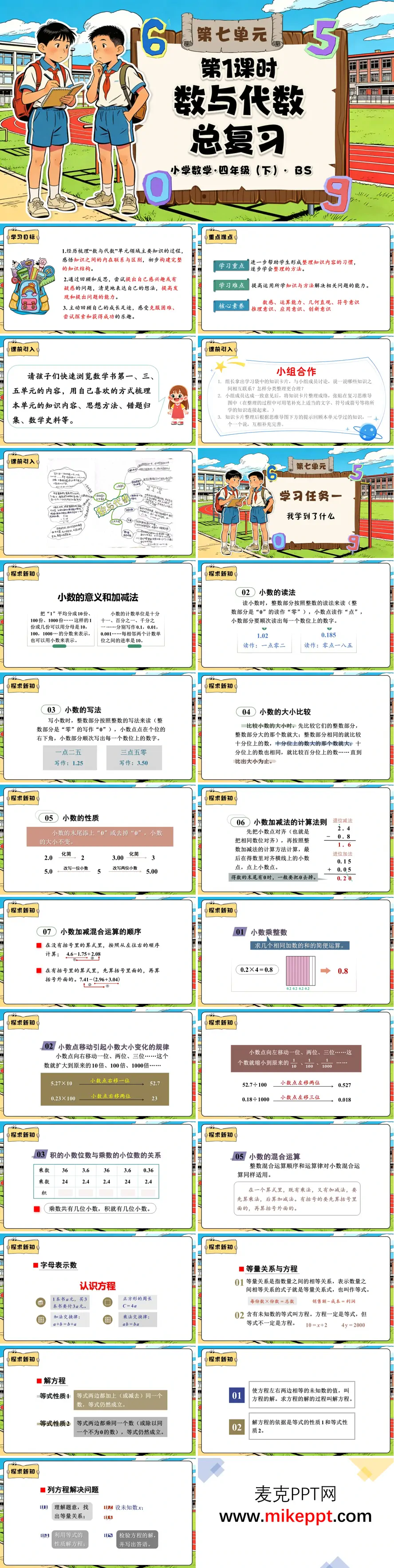 这套北师大版四下数学总复习PPT分两大板块: 第六单元“数据”先让学生小组合作,用条形图(1格多单位)、折线图(升降变化)和平均数(移多补少+公式)把电视节目偏好、跳远成绩、体温记录等生活数据一网打尽,图表绘制与读图策略并重。 第七单元“数与代数”把第一、三、五单元串成链:小数意义→比大小→加减混合→乘法点移规律;方程则借奖品采购、彩带长度、蜜蜂速度等情境,边列式边解方程,并嵌入凑整、分配律等简便运算,让数感与运算能力双落地。