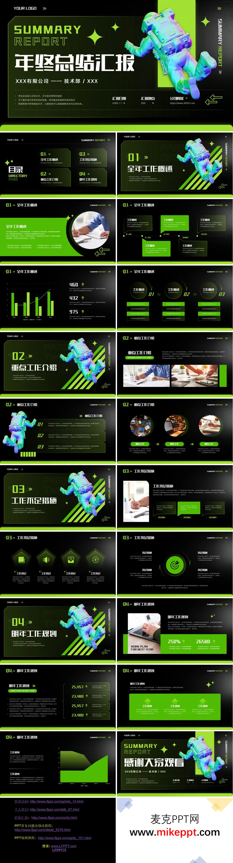 这是一套专为技术部量身打造的科技风年终总结汇报 PPT 模板,整体以黑绿为主色调,搭配赛博朋克风格的 3D 形象元素,视觉效果酷炫且极具未来感,完美契合技术职场的场景氛围。 PPT 的内容框架清晰且实用,分为四大核心模块。首先是“全年工作概述”,这一部分通过分点梳理工作内容,并结合数据图表展示(如数值增长趋势),能够清晰地呈现年度工作的全貌,让听众快速了解过去一年的工作成果与关键数据。 紧接着是“重点工作介绍”,支持图文结合的方式呈现核心项目,搭配分点说明和流程图示,便于突出工作亮点与细节,让复杂的技术项目变得一目了然,充分展现技术团队的专业能力。 “工作不足措施”模块用于复盘问题,通过图标和分块布局,可以清晰地展示不足点及对应的改进方案,帮助团队总结经验教训,为未来的工作提供改进方向。 最后是“明年工作规划”,包含目标数据和任务分块设计,助力团队清晰规划下一阶段的工作,确保目标明确、任务可执行,为新一年的工作奠定坚实基础。 除了这四大核心模块,PPT 还精心设计了封面、目录和结尾页。每一页都预留了充足的编辑区域,方便技术岗人员根据实际需求进行个性化修改。同时,科技感十足的设计不仅增强了汇报的专业性,还提升了整体的吸睛度,让汇报在视觉和内容上都更具吸引力,适合技术岗人员高效完成年终总结汇报,展现团队的专业风采。