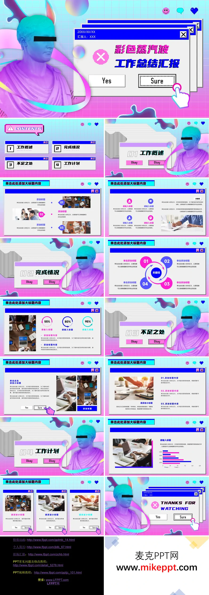这是一套极具创意的彩色蒸汽波风格工作总结汇报 PPT 模板,整体以粉蓝撞色搭配复古电子元素(如弹窗、像素图标)为主视觉,风格新潮且吸睛,非常适合年轻职场或创意类岗位的汇报场景。 PPT 的内容框架清晰且富有创意,分为四大核心模块。首先是“工作概述”,通过分点和图文布局梳理阶段工作方向,同时可以搭配场景图补充细节,让听众快速了解工作重点和方向,兼具视觉吸引力和信息传达的高效性。 在“完成情况”模块,支持使用进度环、环形图展示工作成果占比,还能通过流程图示拆解项目亮点,直观呈现工作成果,让复杂的工作成果变得清晰易懂,充分展现工作的价值和亮点。 “不足之处”模块通过分块布局明确问题点,同时预留了改进措施的填写区域,方便在总结经验教训的同时,提出针对性的改进方案,为后续工作提供指导。 最后是“工作计划”,可以分模块列写下一阶段的任务,并搭配图表辅助呈现目标数据,帮助团队清晰规划未来的工作,确保目标明确、任务可执行。 除了这四大核心模块,PPT 还包含了精心设计的封面、目录、各模块详情页和结尾页。每一页都设置了“单击添加内容”的编辑区域,既保留了蒸汽波风格的独特视觉个性,又保证了汇报逻辑的完整性。这种设计不仅让工作总结更加生动有趣,还能确保信息传达的清晰和高效,非常适合年轻职场人或创意岗位的人员在汇报中展现个性与专业,让工作总结汇报成为一场视觉与内容的双重盛宴。