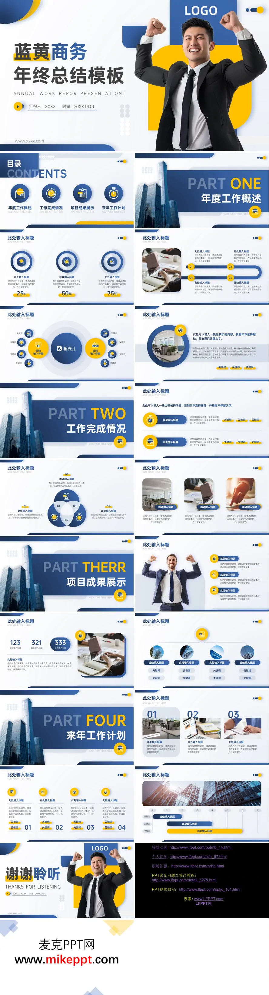 这是一套专为职场年终汇报设计的蓝黄商务风 PPT 模板,整体以沉稳的蓝黄配色为主调,搭配商务人物、城市建筑等专业元素,展现出专业正式的风格,非常适合各类职场年终汇报场景。 PPT 的内容框架清晰且实用,分为四大核心模块。首先是“年度工作概述”,通过进度环和流程图示梳理全年工作方向,能够帮助汇报者清晰地呈现工作主线和核心内容,让听众快速了解过去一年的工作重点和布局。 在“工作完成情况”模块,支持分点和多图布局展示任务完成细节,通过图文并茂的方式清晰呈现工作进展,让复杂的任务变得一目了然,充分展现工作的系统性和完整性。 “项目成果展示”模块则通过数据和图标突出项目亮点,直观呈现工作收效。这种设计不仅能让成果更加直观,还能有效提升汇报的说服力,让听众对项目的价值和影响力有更深刻的理解。 最后是“来年工作计划”,通过分模块和时间轴等形式规划下一阶段任务,助力目标落地。这种清晰的规划方式能够帮助团队明确未来方向,确保新一年的工作有序推进。 除了这四大核心模块,PPT 还包含了精心设计的封面、目录、各模块详情页和结尾页。每一页都预留了“此处输入标题 / 内容”的编辑区域,方便用户根据实际需求进行个性化修改。这种设计既保证了汇报逻辑的完整性,又通过商务化的设计风格增强了汇报的专业质感,能够高效辅助职场人士完成年终总结汇报,让汇报在内容和视觉上都更具专业性和说服力。