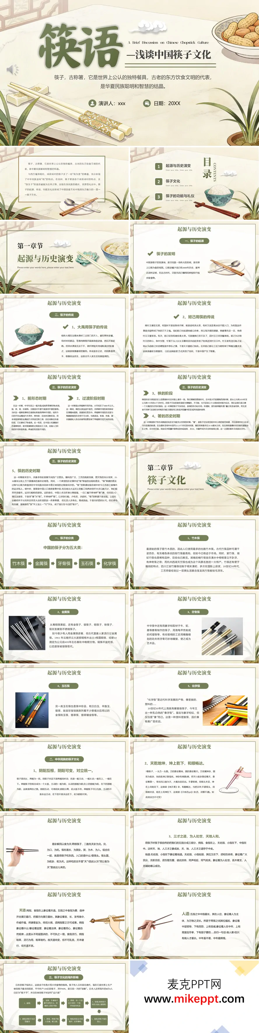 以下是对该PPT内容的综合介绍,约300字: 这套PPT以“中国筷子文化”为主题,系统阐述了筷子作为东方饮食文明代表的深厚内涵。开篇从筷子的起源切入,结合大禹治水时折枝夹食的传说,说明筷子因热食需求而诞生;随后通过商纣王宠妃妲己以玉簪夹菜的典故,展现筷子在历史中的演变。PPT还梳理了筷子从单根木棍到双棒并用的发展历程,并详细分析了其在不同时期的形态变化,如青铜时代的“梜”与东周至明代的“箸”,最终演变为今日“筷”的称谓演变,体现了民俗文化的适应性。 在文化层面,PPT通过分类展示竹木、金属、牙骨、玉石及化学材质筷子,突出其工艺多样性。其中,竹木筷的天然质朴与玉石筷的华贵形成鲜明对比,而金属筷的历史痕迹则印证了古代社会的阶层差异。 PPT更从哲学角度解读筷子:双筷象征阴阳对立统一,方头圆尾对应天地乾坤,持握方式蕴含“三才之道”(天地人),折射出中华民族崇尚和谐的传统观念。此外,还提及筷子对日本等东亚国家的影响,如日本“剖箸”习俗和筷子节,凸显其文化辐射力。 最后部分强调筷子的实用功能(挑、拨、夹、扒)与礼仪规范,列举使用禁忌如“三长两短”“仙人指路”等,生动呈现了筷子在日常生活与礼仪中的双重角色。整体内容层次清晰,兼具历史深度与文化广度,生动展现了中国筷子文化的独特魅力。