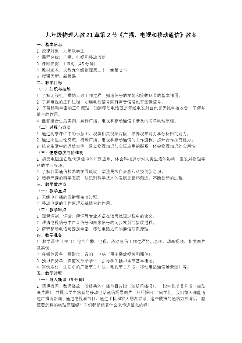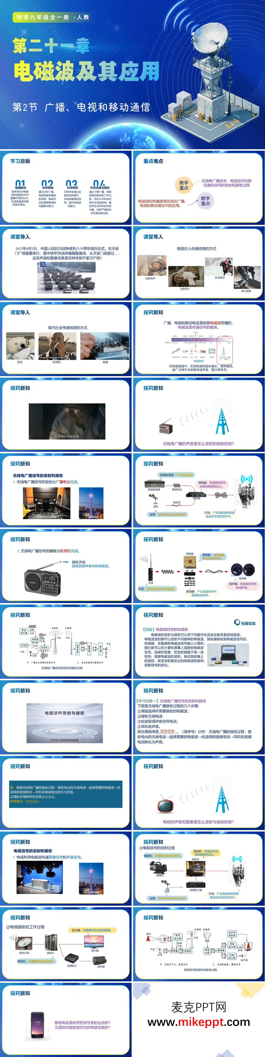 这份为人教版九年级物理第二十一章“电磁波及其应用”量身打造的教学PPT,用两节课的篇幅把看不见、摸不着的“电波”讲得既连贯又接地气。第一节“电磁波的海洋”先抛出一个悬念:远在38万公里之外的“玉兔号”如何把月面照片发回地球?学生带着问题走进课堂,教师随即亮出四维学习目标——知道电磁波是变化电磁场的自我传播,会用c=λf进行简单计算,能通过实验验证“变化的电流生波、真空中能传波”,并感受我国北斗、天眼等大国重器里的电磁智慧。接下来的40分钟,师生共同完成三组活动:用电池和导线在收音机旁制造“咔嗒”声,体验“迅速变化的电流就是波源”;把手机放进抽成真空的玻璃罩,亲眼见证信号依旧满格,测得波速约3×10⁸m/s;拖动交互课件里的“波谱长卷”,从千米级长波到皮米级γ射线一路浏览,顺带解释为什么微波炉门要加金属网、为什么射电望远镜要建在大窝凼。 第二节“广播、电视和移动通信”以抗战胜利八十周年阅兵直播切入:1945年的胜利消息靠口耳相传,2025年的4K画面却可实时传至全球,背后正是无线电技术的飞跃。教师先让学生拆解一台废旧收音机,观察天线、调谐电路、检波器如何“沙里淘金”把高频载波变成声音,再用动画同步演示电视台“摄像管—调制—发射塔”与手机“麦克风—基站—光纤骨干网”的信号旅程。对比1G只能打电话、6G有望实现全息通信的演进史,学生自然理解“频率越高、带宽越宽、信息越多”的技术逻辑。 两节课均嵌入“即时任务+分层练习”:课堂现场用软件模拟给月球基地选址通信频段,课后A类作业画一张家庭电磁波使用清单,B类拓展则鼓励用废旧路由器制作简易发射器并测量波长,拍照上传分享。整套课件以“问题—探究—应用—拓展”为主线,把抽象公式、实验现象、生活应用与科技前沿串成一条看得见的“电波之链”,既夯实理论基础,又点燃学生把知识用于未来的创造热情。