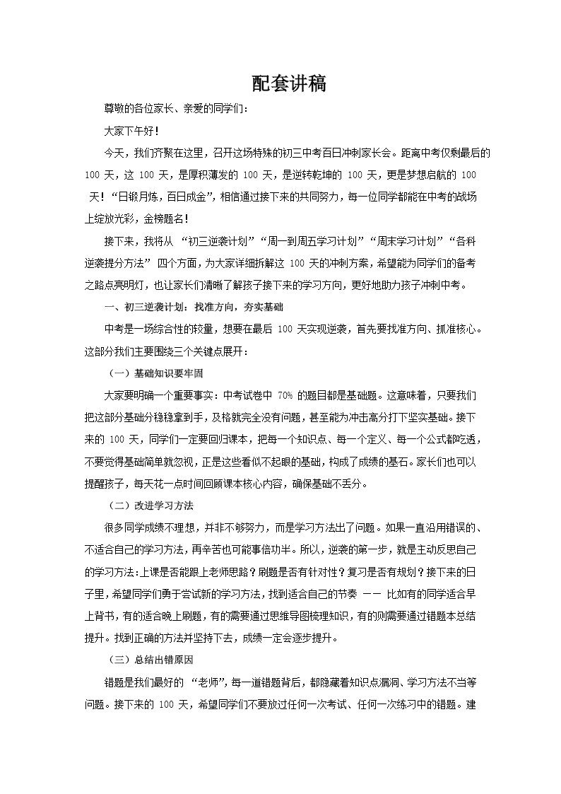 这是一套《初三中考百日倒计时动员》PPT,专为中考冲刺阶段的学生设计。核心内容分为四大模块: **逆袭计划篇**强调三大原则:夯实基础(中考试卷70%为基础题)、改进学习方法、建立错题分析机制,要求学生详细记录错因、知识点和改进方案。 **日常学习篇**提供精细化时间安排:周一至周五每晚安排数学40分钟、物理35分钟、化学35分钟,每科均包含5分钟知识复习、20分钟作业练习和10-15分钟专题或错题训练,科目间休息5分钟。 **周末强化篇**延长单科学习时间至50分钟,增加专题训练比重,重点进行错题归纳和方法总结。 **提分秘籍篇**针对不同学科特点给出策略:数学重基础+专题渐进;英语强调作文模板积累、语法思维导图和带着问题阅读;物理要求概念辨析、公式烂熟于心和真题训练;化学则必须攻克方程式与元素周期表背诵。 整体风格简洁务实,以"抓基础、重错题、强专题"为主线,为百日冲刺提供可执行的行动方案。