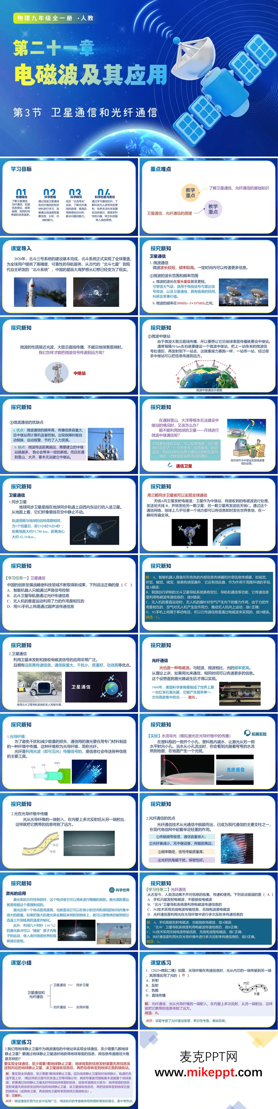 这份人教版九年级物理第二十一章“电磁波及其应用”的整套PPT,用三节“阶梯式”课堂把看不见的电波讲得层层递进、环环相扣。第一节“电磁波的海洋”先借“玉兔号”在38万公里外如何把月背照片发回地球这一真实悬念,让学生带着问题走进课堂:没有电线,信号靠什么跨越真空?教师随即给出四维学习目标——知道电磁波源于“迅速变化的电流”,明白它无需介质、在真空中以约3×10⁸m/s飞奔,会用c=λf解释波长与频率的此消彼长,并能从国家重器如中国天眼、北斗导航里感受电磁技术的中国高度。紧接着,学生动手完成“电池+导线+收音机”实验,亲耳验证“咔嗒”声就是诞生中的电磁波;再把手机放进真空罩,目睹信号依旧满格,直观测得波速接近光速;最后拖动横贯10个数量级的“电磁波谱长卷”,从千米长波到皮米伽马,一路回答“为什么微波炉门要加金属网”“为什么射电望远镜要蹲进贵州洼地”。 第二节“广播、电视和移动通信”以抗战胜利八十周年阅兵直播切入:1945年的胜利喜讯靠电台摩尔斯码,2025年的4K画面却可实时回传,背后正是无线电技术的迭代。教师先让学生拆一台废旧收音机,找到天线、调谐、检波三大件,理解“沙里淘金”的选频原理;再用动画同步演示电视台“光→电→高频载波→发射塔”与手机“声→电→基站→光纤骨干”的完整链路;对比1G只能打电话、6G有望全息通信的演进史,学生自然悟出“频率越高、带宽越宽、信息越多”的技术逻辑。 第三节“卫星通信和光纤通信”以北斗全球组网的新闻视频开场:为什么青藏高原无人区也能收到导航信号?教师先用“锅盖天线+噪声计”演示微波通信的“直线+易挡”短板,引出“把中继站搬到太空”的思路——三颗地球同步卫星即可覆盖全球;紧接着做“水流导光”趣味实验:暗箱里一束激光顺着弯曲的水流前进,学生惊呼“光竟然会拐弯”,教师顺势讲解全反射原理,对比光纤与同轴电缆的容量差异,用“一根头发丝可同时传百万路4K视频”的震撼数据,让学生体会光纤“大容量、低损耗、抗干扰”的独特优势。 整套课件每节都嵌入“即时任务+分层作业”:课堂现场用软件模拟给月球基地选通信频段,课后A类画一张“我家电磁波地图”,B类鼓励用废旧路由器和LED做“简易光纤音乐传输”小制作并拍视频分享。三条主线——“问题情境—实验探究—技术原理—中国故事—拓展应用”——把抽象公式、生活实例与科技前沿拧成一股绳,既夯实理论基础,又点燃学生把知识变成未来创造力的信心。
