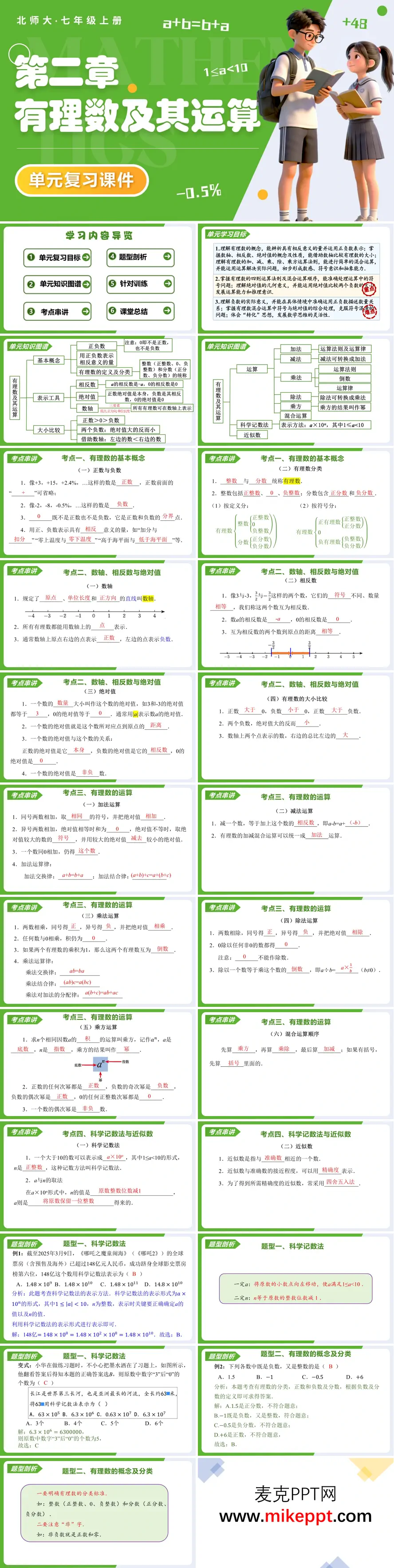 这份文档打包了两套“期末冲刺神器”,学科不同却同样硬核。 第一套是北师大版七年级上册数学《有理数及其运算》复习课件。开篇先甩出“六维目标”——从“能说出有理数家族成员”到“会用科学记数法秒杀天文数字”,一条不落。随即用一张可拖拽的“数轴火车”把正负数、相反数、绝对值、倒数这些易混概念串成可视化坐标,学生拖动车厢即可看见“符号-距离-方向”同步变化,抽象概念瞬间有了落脚点。知识梳理后,课件把运算规则编成“四字口诀”:同号加、异号减、符号随大、乘除同正异负,再配7大题型“套路拆解”:含括号混合运算用“分层剥皮法”、乘方与混合运算用“先定符号再定值”、近似数与科学记数法用“四舍五入+指数平移”,每类题型后面紧跟12道“靶向训练”,答案旁自带“错因雷达”:是符号翻车还是指数漏加?学生一眼对号入座。整章复习在“抽象建模—转化化归—数形结合”的数学思想中完成,让七年级娃也能体验“把现实问题变成数轴上的左右移动”的爽感。 第二套是人教版九年级物理第二十一章《电磁波及其应用》复习课件,用“天问一号从4亿公里外发回高清照片”做开场,先用12条星级目标把考点拆成“颗粒度”知识点:从“说出电磁波诞生条件”到“画完整卫星通信链路图”,每条都配“北斗”“中国天眼”“5G基站”等国之重器案例,让复习自带家国情怀。知识图谱以“电磁波”为中心,向外放射三大分支——产生传播、信息应用、能量应用,再细化为“调制解调、光纤全反射、同步卫星覆盖”等关键词,30秒帮学生重建知识骨架。典例剖析按中考四大题型给出“模板式”拆解:选择题先筛“绝对化表述”,计算题统一“列已知-写公式-带单位”三步走,实验题用“水流导光”GIF复盘全反射,综合题则让学生估算“100 km海底光缆传输延迟”,把几何光学与电磁波应用无缝衔接。课堂尾声发放“分层闯关卡”:A级保满分,B级挑战“用废旧路由器和LED做光纤传声实验”,教师后台实时统计正确率,针对共性错误再推3分钟微课切片,实现“测-评-补”闭环。两套课件,一个把“正负号”玩出花,一个让“电磁波”看得见,双剑合璧,助力学生期末考场稳拿高分。