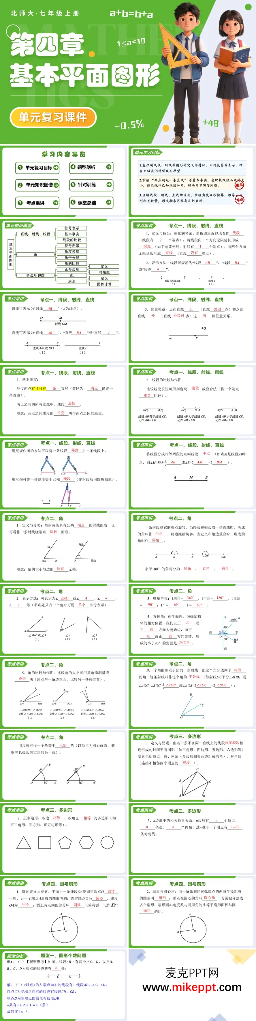 这份北师大版七年级上册数学“双单元”复习包,把第三章与第四章做成了一对“镜像课件”,共用“六步闭环”模板:复习目标—知识图谱—考点串讲—题型剖析—针对训练—课堂总结,节奏统一,干货加倍。 第一套“整式及其加减”先甩出立体目标:一眼识别单项式、多项式“身份”,熟练合并同类项、去括号,能把生活语言“翻译”成整式模型。知识图谱用“彩色方块”动画把2x、3x自动吸成5x,视觉冲击让“合并”秒变“积木拼搭”;去括号法则配“盾牌变色”特效——正括号保持原色、负括号全员反转,学生一眼记住“负号传染定律”。考点串讲部分,教师用“手机套餐计费”“长方形拼花”两个真实情境示范“字母代换→列式→化简→求值”的完整链路,让“模型思想”落地生根。7类题型覆盖概念辨析、书写规范、去括号、加减混合、规律探究、实际应用、易错陷阱,每类后面甩12道“靶向题”,解析旁自带“字母雷区提醒”:漏单位、指数错位、括号漏乘,逐项标红,错题原因一目了然。 第二套“基本平面图形”换上几何外衣,目标升级为“能用三种语言描述图形——文字、符号、图形”,并掌握尺规作图、角度计算、扇形面积等量法。知识图谱先拉一条“点→线→角→多边形→圆”进化树,再配“一图多考”动图:同一条射线,旋转30°、45°、90°,让学生即时读出互补角、余角、对顶角,几何直观瞬间拉满。考点串讲把“线段中点、角平分线、多边形外角和、扇形弧长”四大高频模型做成“折叠卡片”,点开即有口诀:中点得半、角平分得半、外角和360、扇形看比例。7类题型从“数线段”到“折扇张开角”,再到“跑道起跑线差距”,层层递进,12道训练题附“作图动图”答案:尺规步骤一键播放,误差控制在1 mm内,学生可跟画比对。课堂总结用“分类讨论+抽象建模”双思想点睛:几何不再是“看图说话”,而是把千变万化图形拆成“基本模块”再重组。两套课件一代数一几何,一彩一素,却共用同一套“目标—图谱—题型—训练—总结”高速通道,让七年级学生在期中、期末双线战场上,左手整式运算稳准狠,右手图形度量快精美,双杀高分。