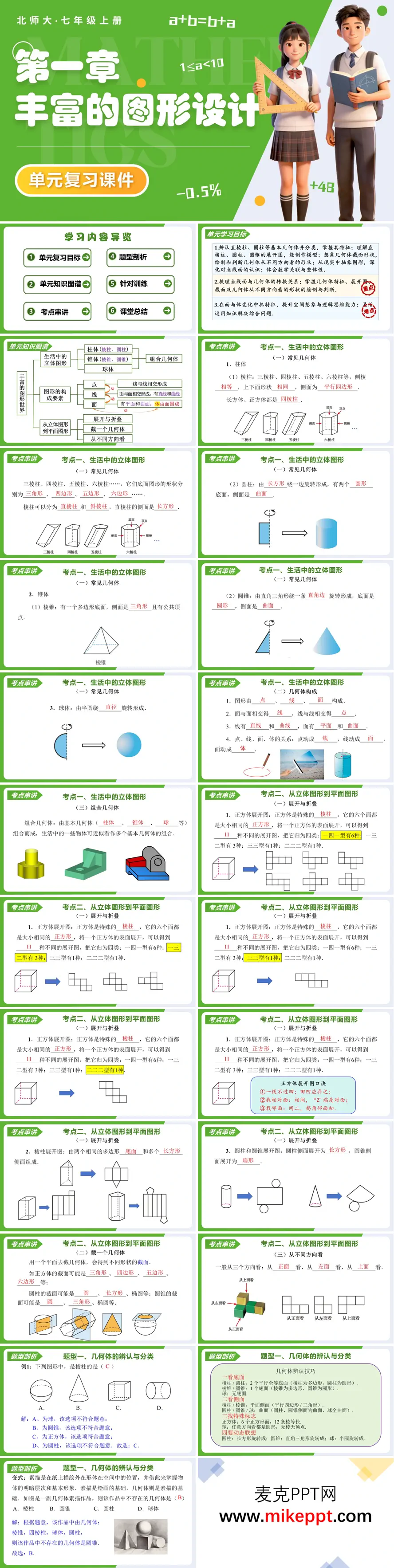 这份北师大版七年级上册数学复习文档,把“空间—平面”两条几何线装进同一套“六步闭环”模具:复习目标—知识图谱—考点串讲—题型剖析—针对训练—课堂总结,让立体与平面相互呼应,一次把七年级的几何想象力和计算力拉满。 第一套“丰富的图形世界”负责“搭空间”。课件先用“盲盒拆几何”短视频吊胃口:快递箱、金字塔、足球依次旋转亮相,学生3秒说出柱、锥、球“身份”。随后目标聚焦——能拆出点线面、能判断展开图、能预判截面形状、能还原三视图。知识图谱把正方体展开图画成“11种拼图”,可点击折叠,错了自动弹回,学生像打游戏一样把平面“折”回立体;截面互动更直观,虚拟刀横切、竖切、斜切,截面从正方形到六边形实时变化,空间观念在指尖生长。5类题型由浅入深:辨体→数面棱顶点→选展开图→判截面→画三视图,每类配12道“靶向题”,解析旁附“转化思想”提示:先想立体→再压成平面→最后还原立体,三步走让想象有轨道。 第二套“基本平面图形”转向“精耕平面”。目标升级:能用三种语言(文字、符号、图形)讲清线段、射线、直线,会尺规作中点、角平分线,会算扇形弧长面积。知识图谱先拉“点→线→角→多边形→圆”进化树,再配“一图多考”动图:同一条射线旋转30°、45°、90°,学生即时读余角、补角、对顶角,几何直观秒上线。考点串讲把“四大模型”做成折叠卡片:中点得半、角平分得半、多边形外角和恒360°、扇形看圆心比例,口诀一背,计算一步到位。7类题型覆盖概念辨析、度数计算、作图步骤、规律探究、实际应用、易错陷阱,12道训练题附“尺规动图”答案,可暂停可回放,误差控制在1毫米内,学生跟画即校正。课堂总结用“数形结合+抽象建模”双思想点睛:把现实跑道、披萨扇形、时钟夹角统统抽象成“点线角圆”模块,再套公式秒杀。 两套课件一立体一平面,一折叠一旋转,却共用同一套“目标—图谱—题型—训练—总结”高速通道,让七年级学生左手能拆正方体展开图,右手能算扇形披萨切多大,空间想象与平面计算双轮驱动,期中、期末几何题稳拿高分。