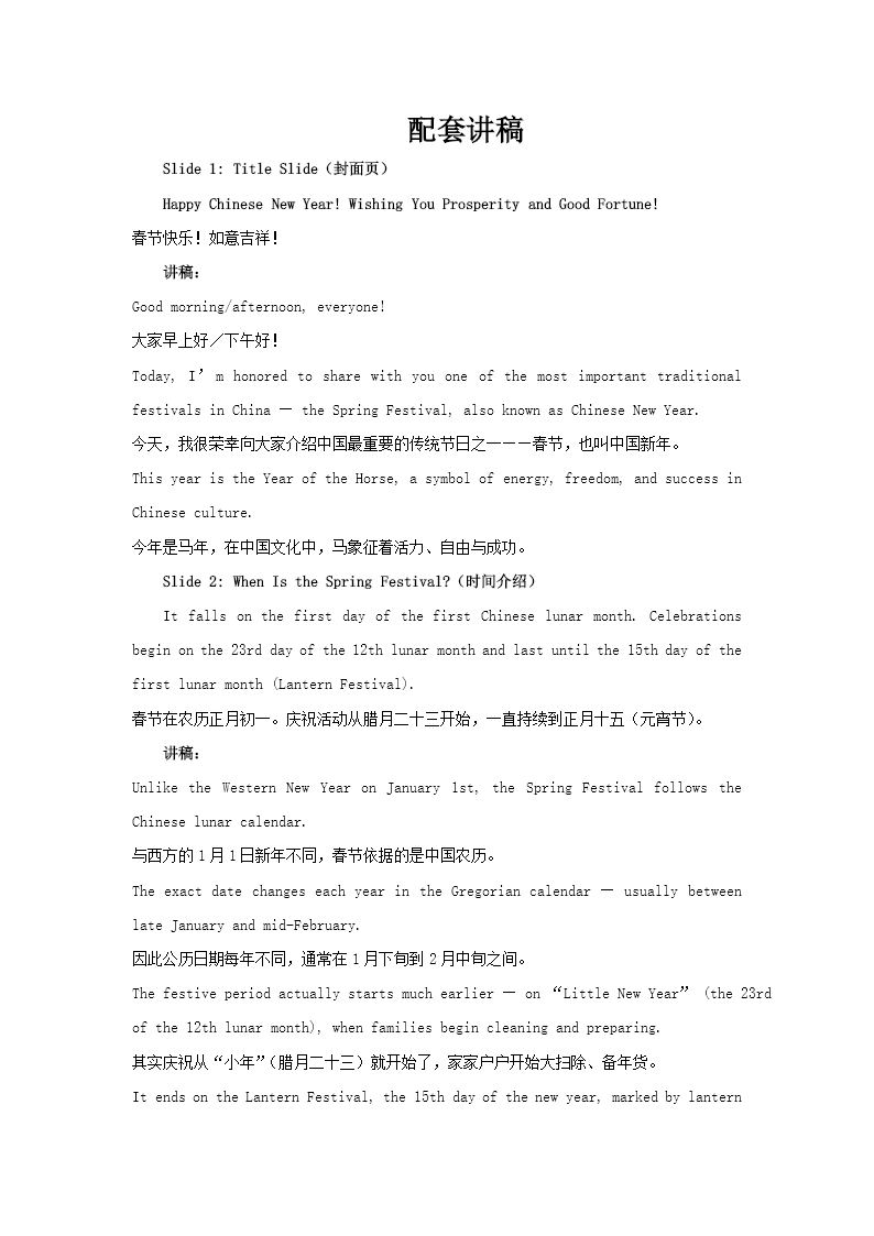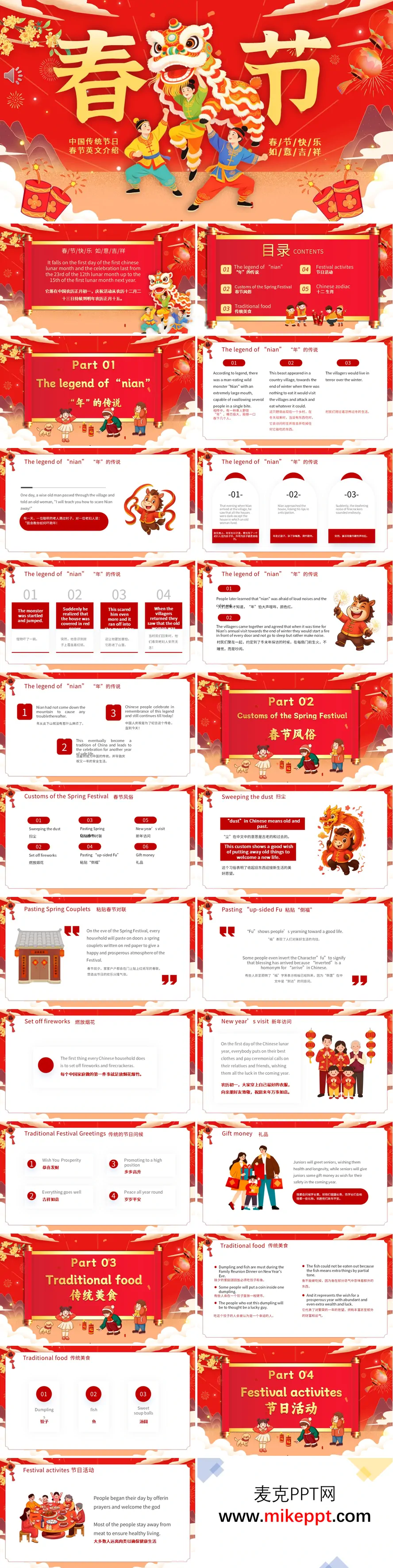 这份 PPT 是一份精心制作的中英双语春节主题介绍材料,整体色调以喜庆的红色为主,给人带来浓厚的节日氛围,内容结构清晰明了,逻辑性强。 PPT 开篇以 “春节” 主题页引入,简洁明了地说明春节是中国最重要的传统节日之一,时间跨度从农历腊月廿三一直持续到正月十五。紧接着,目录分为五个部分,涵盖了春节的各个方面,包括 “年” 的传说、春节风俗、传统美食、节日活动以及十二生肖,为观众呈现了一个全面的春节文化画卷。 在第一部分中,详细讲述了 “年” 的传说。相传在古代,有一种名为 “年” 的怪兽会在岁末年初侵袭村庄,给人们带来灾难。后来人们发现 “年” 怕红色和响声,于是便在春节期间贴红纸、放鞭炮来驱赶它,这些习俗逐渐演变成了如今丰富多彩的春节年俗,为春节增添了神秘色彩和深厚的文化底蕴。 第二部分聚焦于春节风俗。从扫尘(寓意除旧迎新)开始,到贴春联、贴 “福” 字,再到放烟花、拜年、发压岁钱等,详细介绍了春节期间的各种传统习俗。同时,还补充了一些常见的传统祝福语,如 “恭喜发财” 等,让观众能够更好地了解春节期间人们相互表达祝福的方式,感受到春节的热闹与温馨。 第三部分着重介绍了春节的传统美食。饺子是春节必备的美食之一,它不仅寓意吉祥,部分地区还会在饺子里包上硬币,寓意新的一年好运连连;鱼象征着年年有余,是春节期间餐桌上不可或缺的一道菜;汤圆代表团圆,寓意着家人团聚,幸福美满。这些美食不仅味道鲜美,还蕴含着丰富的文化内涵,是春节文化的重要组成部分。 第四部分说明了春节期间的节日活动。年初一人们会进行祈福活动,祈求新的一年平安顺利;同时,年初一忌串门,以避免带来晦气;此外,逛庙会也是春节期间一项重要的活动,人们可以在庙会上欣赏各种民间艺术表演,品尝各种特色小吃,感受浓厚的节日氛围。 最后一部分展示了十二生肖,通过生动形象的图片和文字介绍,让观众对十二生肖有了更深入的了解。收尾页再次送上温馨的春节祝福,为整份 PPT 做了一个圆满的收尾。 总的来说,这套 PPT 内容全面,不仅涵盖了春节的文化知识,还兼顾了节日氛围的营造,非常适合用于向不同文化背景的人科普春节文化,让他们更好地了解这一具有深厚文化底蕴的中国传统节日。