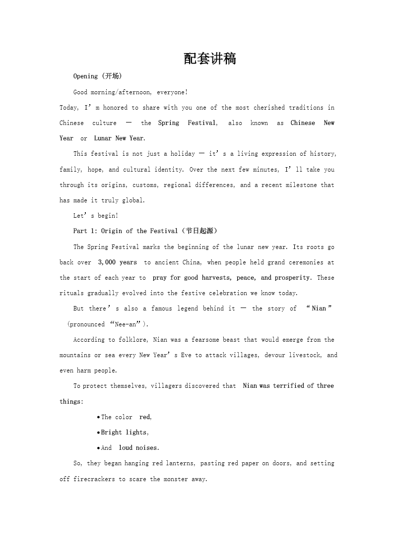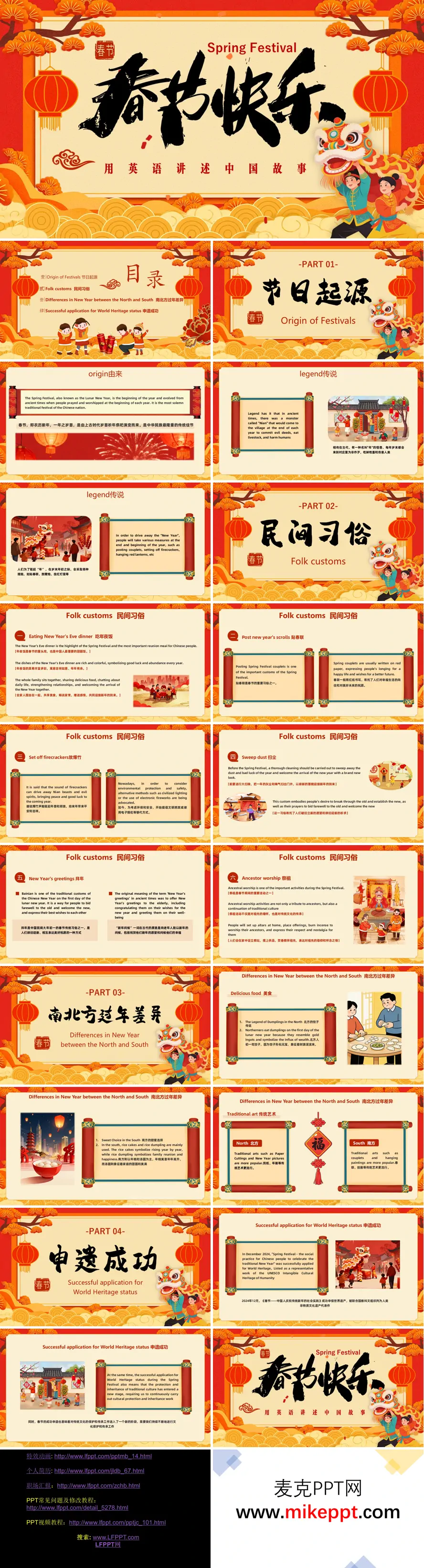 这是一套以“用英语讲述中国故事”为主题的中英双语春节文化介绍 PPT,整体风格融合了暖黄色调与红色元素,营造出浓厚的传统中式氛围,让人在视觉上就能感受到春节的温暖与喜庆。 PPT 内容分为四个部分,系统地介绍了春节的各个方面。首先,从节日起源讲起,清晰地阐述了春节即农历新年,其历史可追溯至上古时期的岁时祭祀活动。同时,引入了“年兽”传说,生动地讲述了人们如何通过贴红纸、放鞭炮等方式驱赶年兽,从而形成了如今丰富多彩的春节习俗,为整个节日增添了神秘色彩和文化深度。 在民间习俗部分,PPT 详细介绍了春节的核心习俗,如年夜饭——这是全家团聚的重要家宴,象征着团圆与幸福;贴春联、放爆竹、扫尘、拜年、祭祖等习俗也逐一被详解,每一种习俗背后都蕴含着独特的文化寓意,展现了中国人对新年的美好祈愿和对传统文化的传承。 第三部分聚焦于南北方过年的差异。通过对比,展示了南北在美食和传统艺术上的不同偏好。北方人过年喜欢吃饺子,象征着财富和好运;而南方人则偏爱汤圆或年糕,寓意着团团圆圆和年年高升。在传统艺术方面,北方人喜欢贴年画,色彩鲜艳、形象生动;南方人则更倾向于挂剪纸,图案精美、寓意吉祥。这些差异不仅丰富了春节的文化内涵,也体现了中国地域文化的多样性。 最后,PPT 提到了春节申遗成功的重大意义。2024 年 12 月,春节被列入联合国非物质文化遗产名录,这一成果不仅是对春节文化价值的高度认可,更是对中华传统文化保护与传承的重要推动。它让世界看到了中国文化的魅力,也为春节的国际化传播奠定了坚实基础。 整套 PPT 内容详实,既有对春节文化内涵的深入解读,也兼顾了地域差异和文化价值的体现,非常适合用于对外科普春节文化,让更多人了解这一充满魅力的中国传统节日。