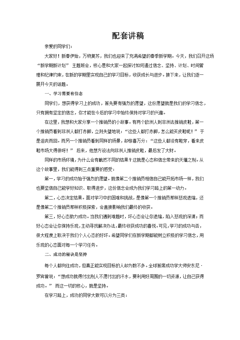 这是一套以“新学期 新计划”为主题的班会课件,旨在帮助学生从思想认知到行动方法上全面规划新学期的学习和生活。课件围绕“信念、坚持、计划、时间、纪律”五个核心要素展开,内容分为六个部分,层层递进,逻辑清晰。 第一部分“学习需要有信念”,着重强调信念在学习中的重要性。通过生动的案例和分析,让学生明白成功需要建立自信和明确的目标。信念不仅是学习的动力源泉,更是克服困难的精神支柱。 第二部分“成功的秘诀是坚持”,深入探讨了坚持的力量。通过分析少数人成功的原因,指出在学习过程中容易放弃的三种心态,并引导学生培养毅力,学会在面对挫折时不轻易言败。 第三部分“计划是成功的前提”,阐述了计划在学习中的重要性。以运动员的训练计划为例,类比学习也需要分阶段、有条理地进行规划。同时,课件还给出了制定“有弹性”计划的建议,帮助学生在实际操作中灵活调整。 第四部分“严格遵守学习计划”,强调制定计划前要先“知己”,即明确自身情况和目标。通过讲解按计划执行的好处,如提升学习效率、培养良好习惯等,鼓励学生在新学期中坚持执行自己的学习计划。 第五部分“学会科学利用时间”,通过时间换算、故事分享等方式,让学生深刻认识到时间的宝贵。课件还介绍了艾维利时间管理法,并分享了学习的黄金时段,帮助学生掌握科学的时间管理技巧,提高学习效率。 最后,第六部分“遵守班级纪律规范”,明确了班级纪律的具体要求,并阐述了班干部的职责。通过强调纪律的重要性,帮助学生营造良好的班风,为新学期的学习创造和谐的环境。 整套课件内容丰富,从思想认知到行动方法层层递进,不仅为学生提供了明确的学习方向,还提供了实用的方法和技巧。它是一份非常实用的班会材料,能够帮助学生在新学期中更好地规划自己的学习和生活,为实现目标奠定坚实的基础。