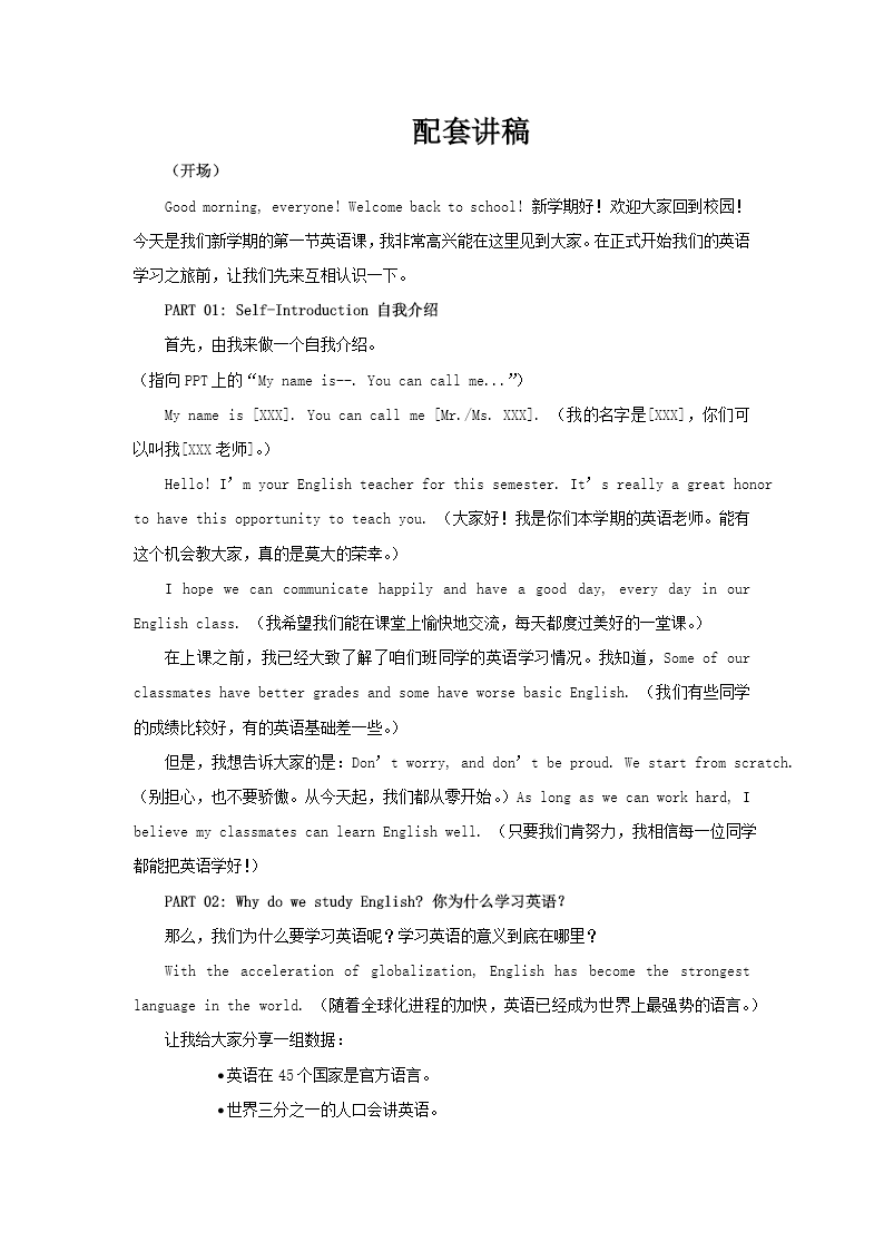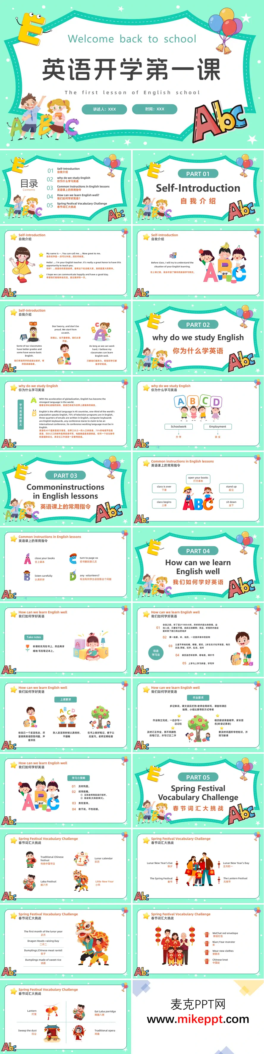 这是一套专为“英语开学第一课”设计的主题课件,整体风格活泼且充满童趣,非常适合英语学习的入门与规划。课件内容分为五个部分,从课堂适应到学习方法,再到趣味拓展,层层递进,旨在激发学生对英语学习的兴趣并引导他们顺利开启英语学习之旅。 第一部分是“自我介绍”,通过提供教师和学生使用的英文自我介绍模板(如“My name is...”),帮助师生快速熟悉彼此。同时,课件强调教师会先了解学生的英语基础,鼓励学生从零开始,不必焦虑,为后续的学习奠定轻松的心理基础。 第二部分“为什么学英语”,明确指出英语作为全球化通用语言的重要性。从升学、就业等多个维度详细解释学习英语的实用价值,让学生从一开始就认识到英语学习的意义,从而增强学习动力。 第三部分“英语课常用指令”,整理了课堂上常用的英文指令,如“open your books(打开课本)”“stand up(起立)”等。通过这些指令的介绍,帮助学生快速适应英语课堂的节奏,减少语言障碍带来的困惑,让学生在课堂上更加自信。 第四部分“如何学好英语”,提供了具体的学习方法和技巧。包括记笔记、多听多读、积极参与课堂互动以及作业规范(如独立完成、及时订正)。此外,还分享了“及时巩固”“敢于开口”等实用的学习小技巧,帮助学生建立良好的学习习惯。 第五部分“春节词汇大挑战”则结合了假期主题,展示了与春节相关的英文词汇,如“Lunar New Year(农历新年)”“WeChat red envelope(微信红包)”等。这一部分不仅兼具趣味性与实用性,还能让学生在熟悉的文化背景下学习英语,增强学习的亲切感和积极性。 整套PPT内容丰富,设计巧妙,从课堂适应到学习方法,再到趣味拓展,全方位地为学生提供了英语学习的引导。它不仅能帮助学生快速融入英语课堂,还能激发他们的学习兴趣,是一份非常实用的英语开学引导材料。